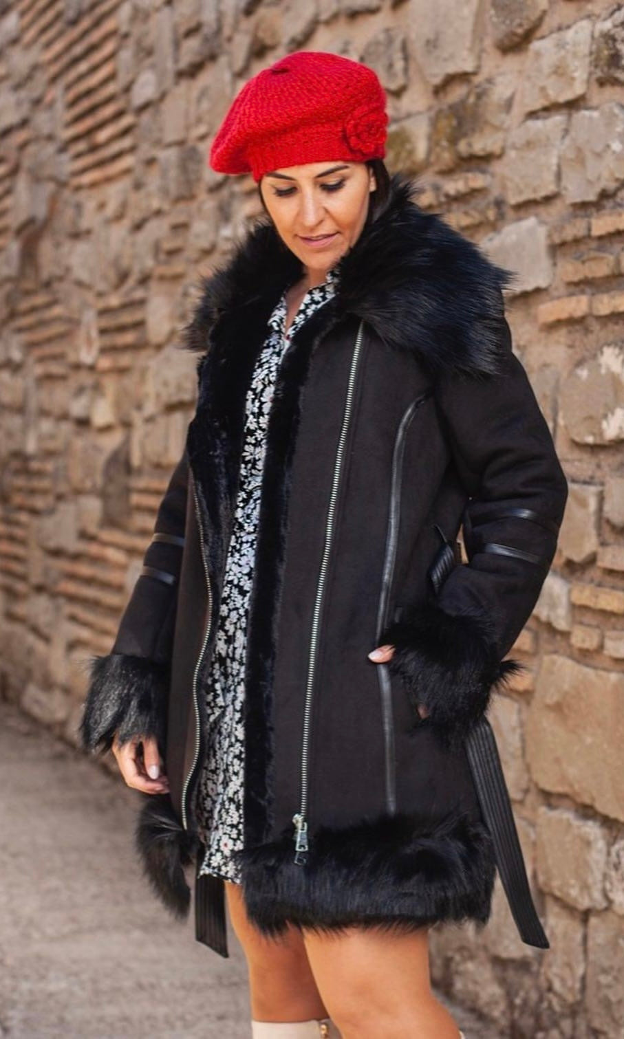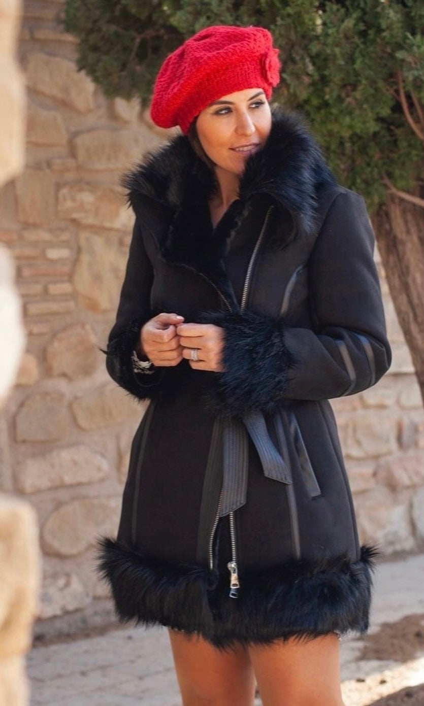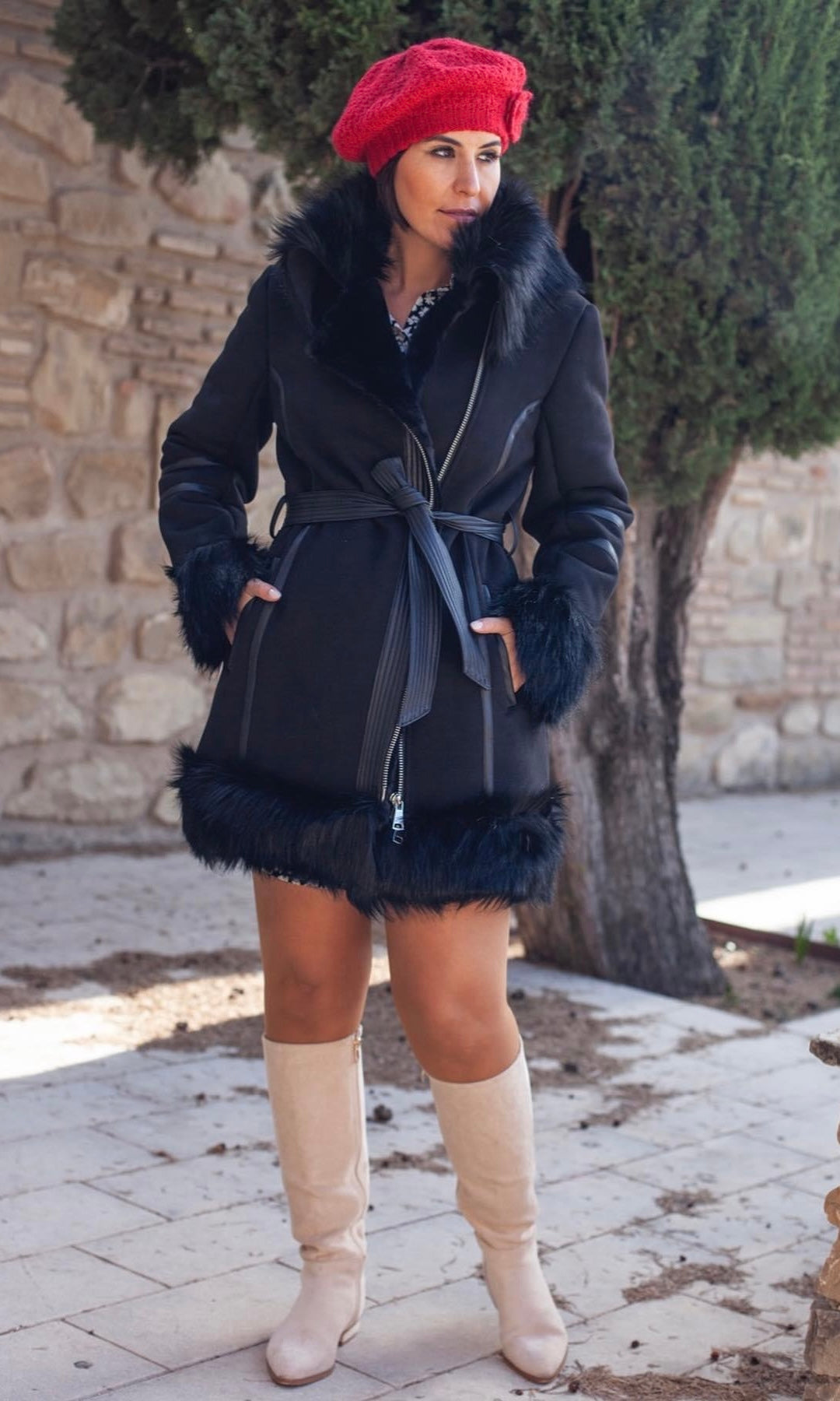 - Este elegante abrigo negro, confeccionado en alta calidad de antelina, es una elección inigualable para enfrentar el frío con estilo. Su interior forrado en pelo proporciona calidez y comodidad, mientras que los detalles de cinturón en polipiel añaden un toque de sofisticación. El cierre con cremallera metálica y los bolsillos laterales ofrecen practicidad sin comprometer el diseño, Con su impecable artesanía y alta calidad, este abrigo se convierte en un imprescindible para elevar cualquier look con elegancia y funcionalidad.