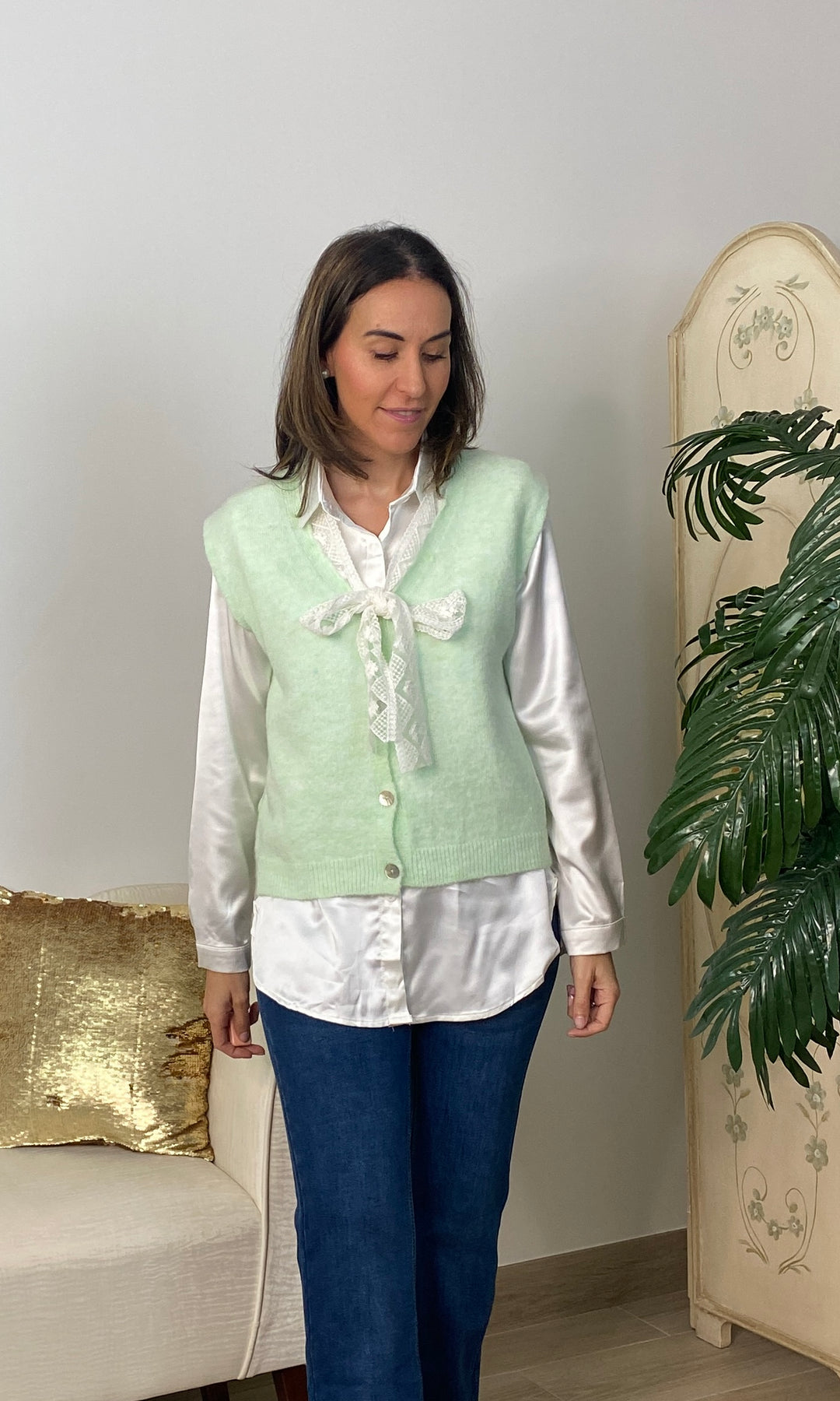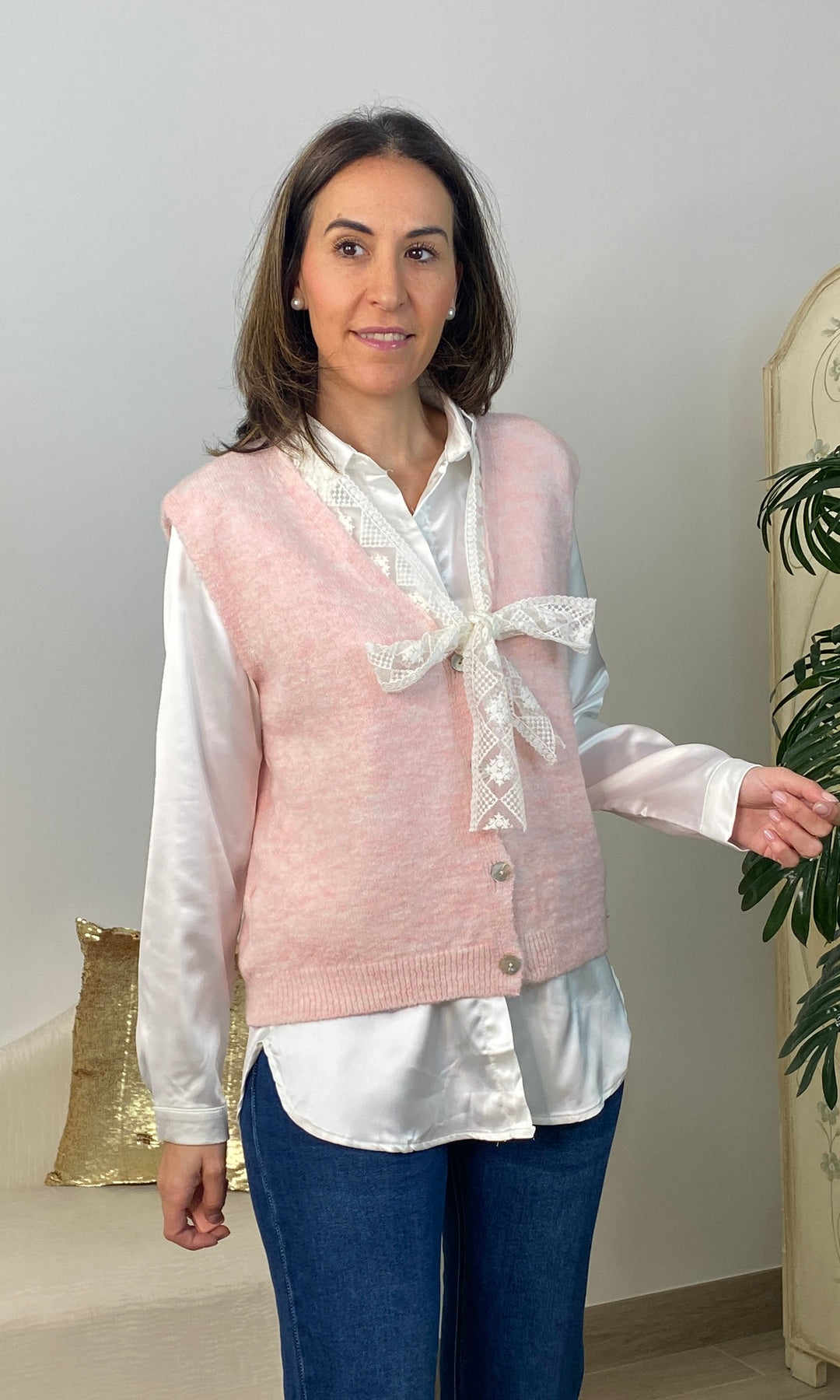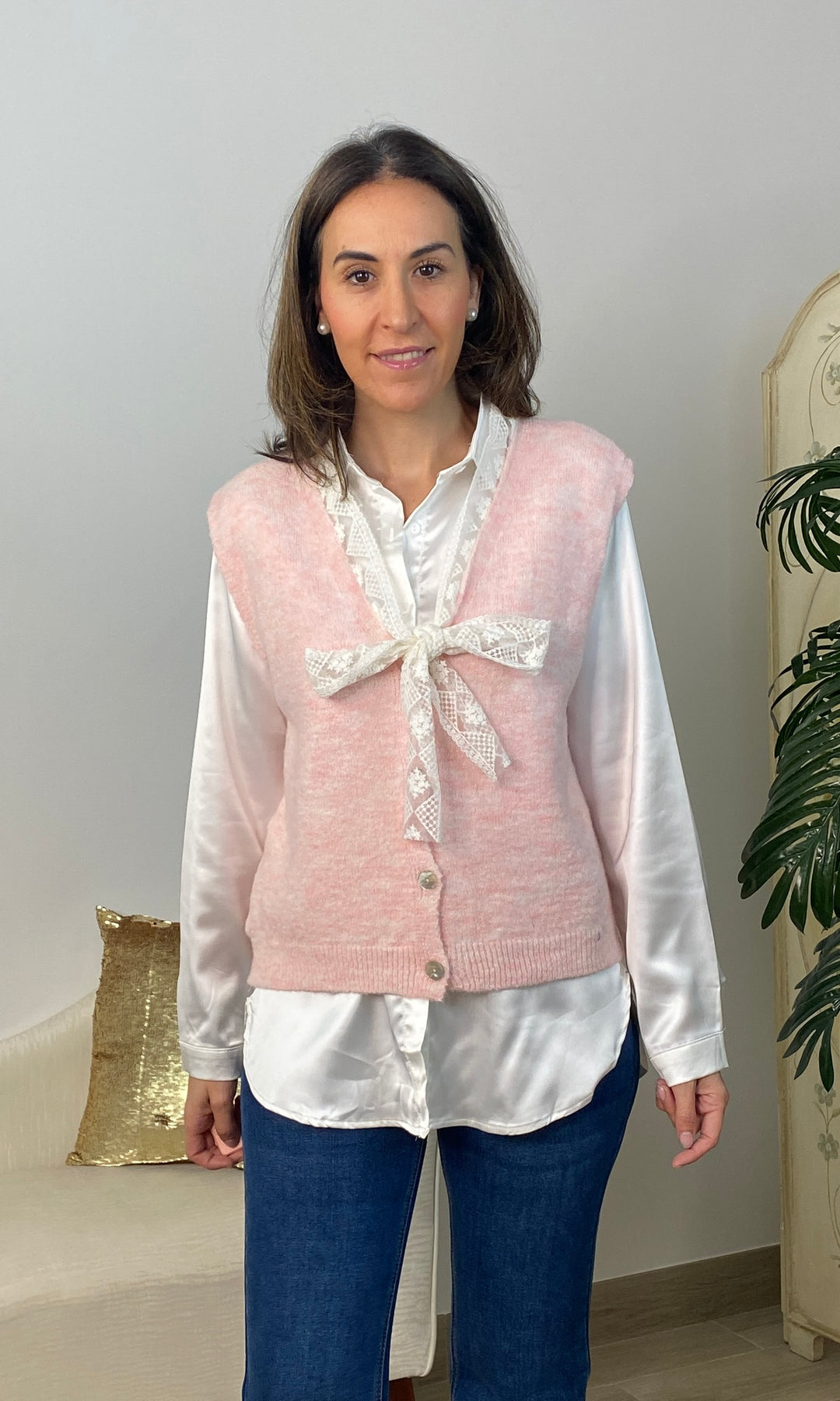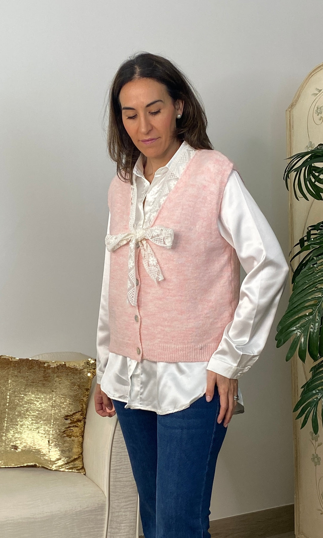 • Chaleco de punto muy fino no pica, cierra con botones y tiene detalle de encaje en color beis alrededor del cuello y terminando con un lazo.