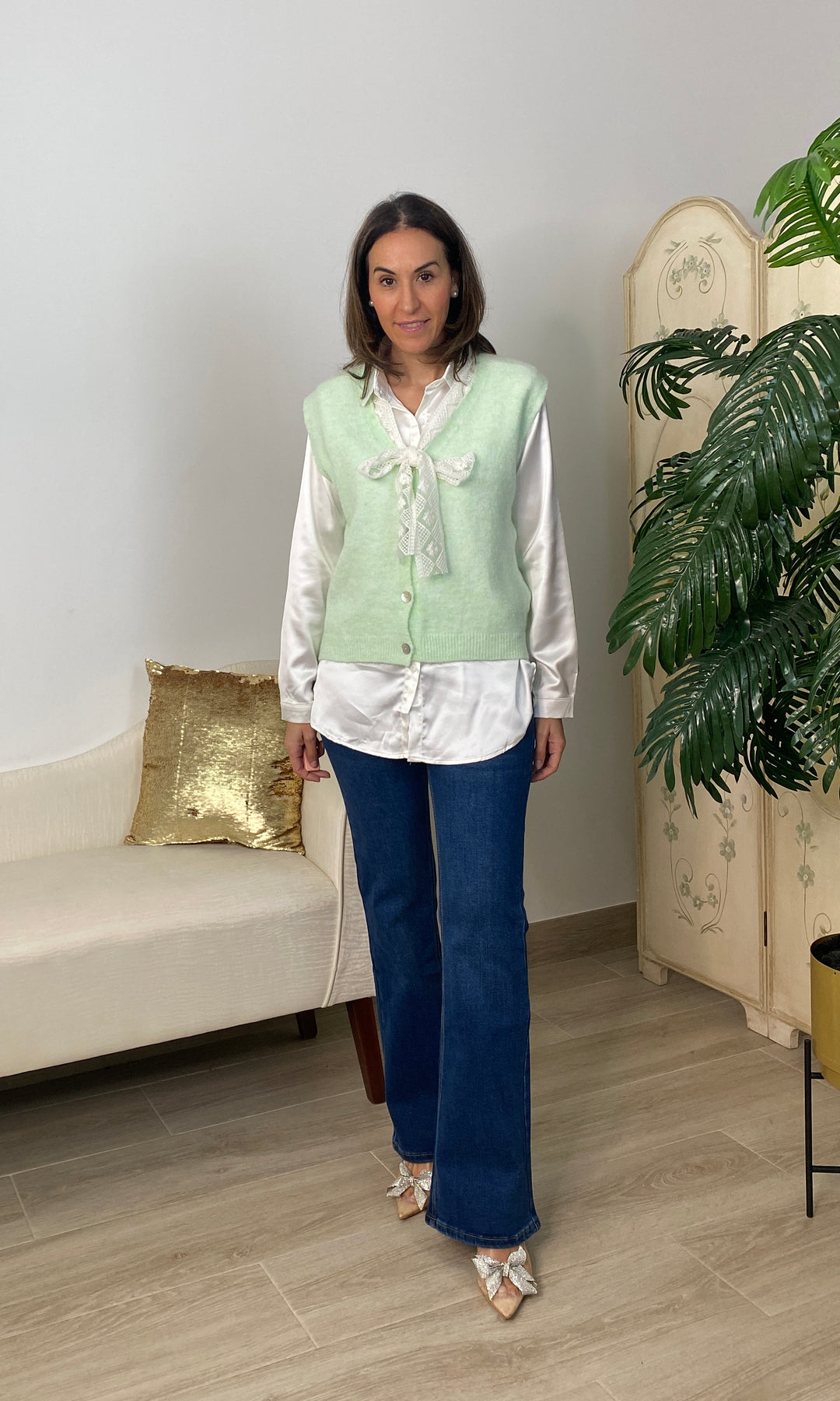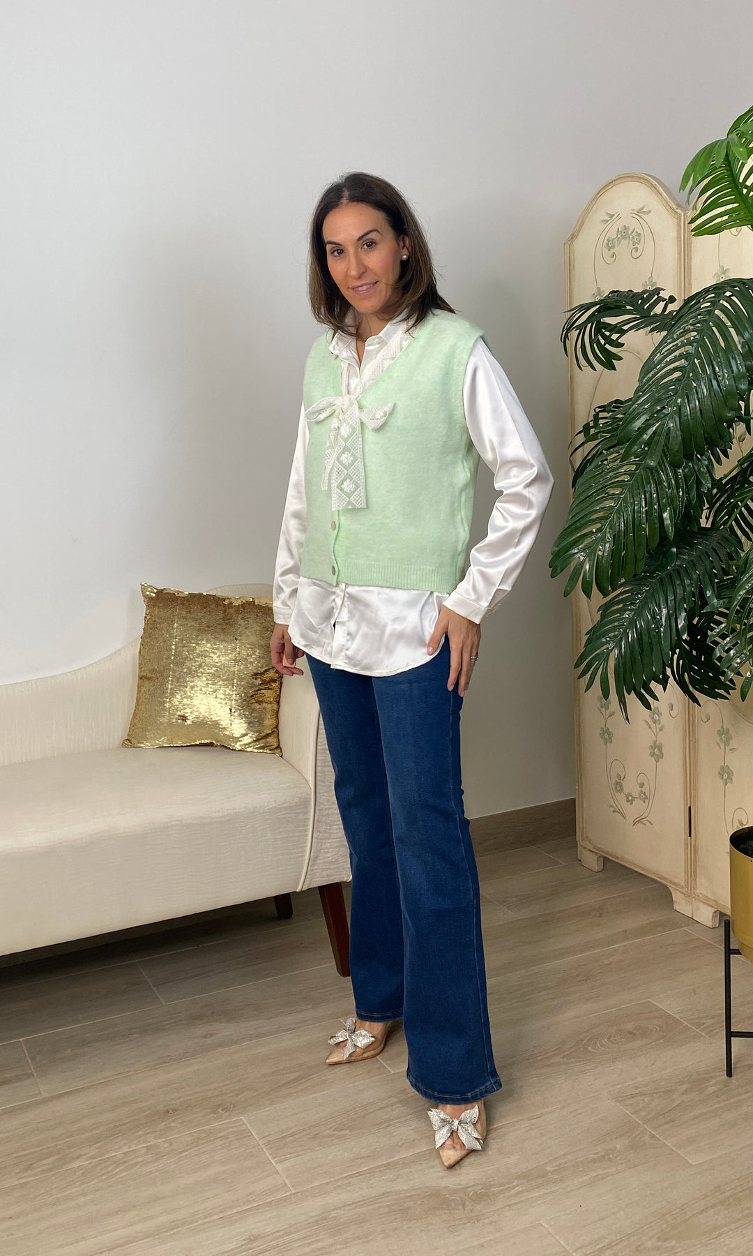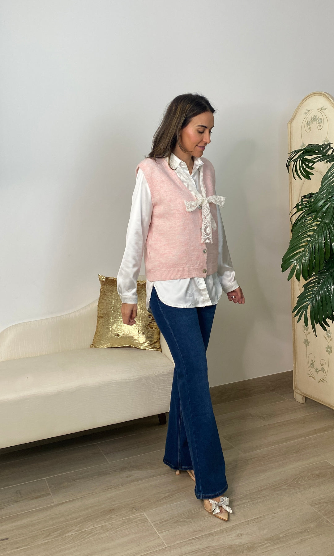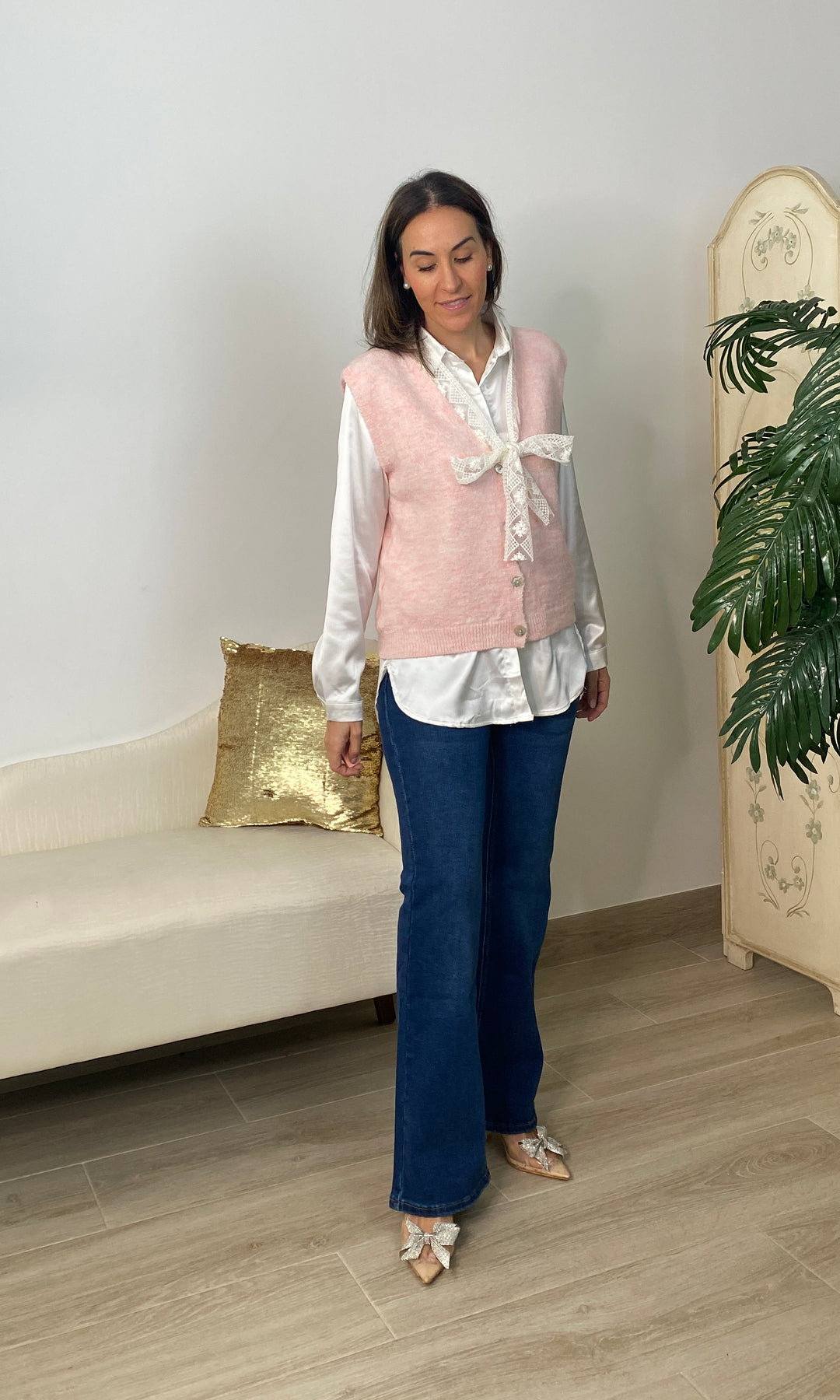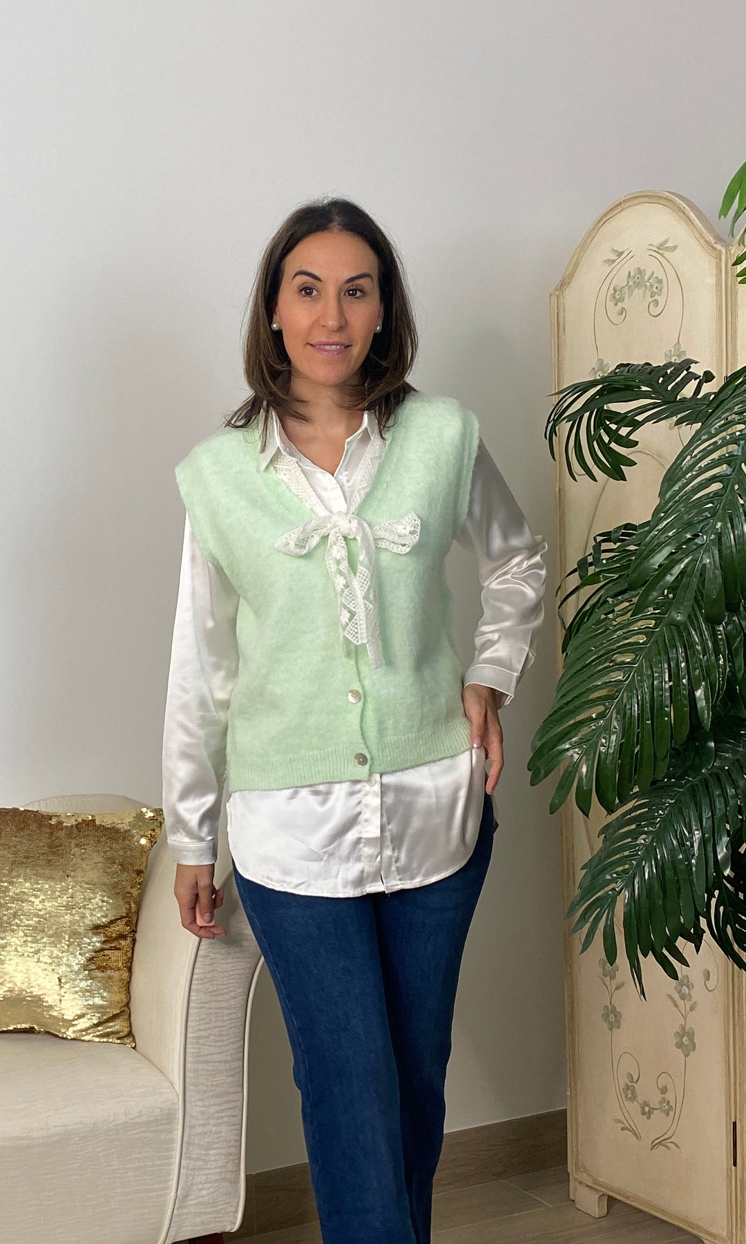 • Chaleco de punto muy fino no pica, cierra con botones y tiene detalle de encaje en color beis alrededor del cuello y terminando con un lazo.