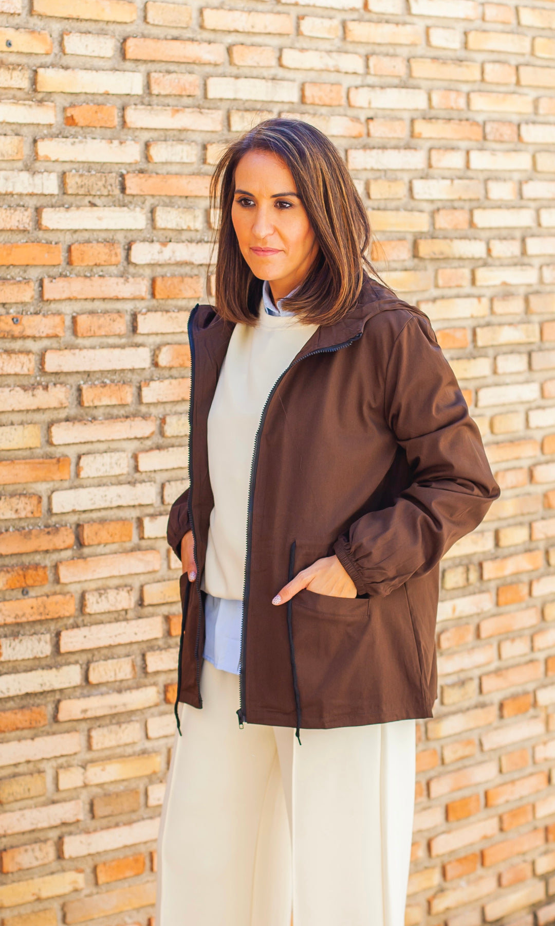 • Chaqueta ligera con capucha. Versátil, moderna y cómoda: así es nuestra chaqueta negra, marrón chocolate, verde, azul marino y camel ligera con capucha, un fondo de armario perfecto para los días en los que necesitas un extra de estilo sin renunciar al confort. Su diseño con cremallera frontal, bolsillos laterales y bajo ajustable la convierte en una prenda práctica y favorecedora para cualquier ocasión. Confeccionada en un tejido suave y fluido, se adapta fácilmente a looks más casuales o combinaciones más elegantes. Ideal para entretiempo o para dar el toque final a tus conjuntos de diario.