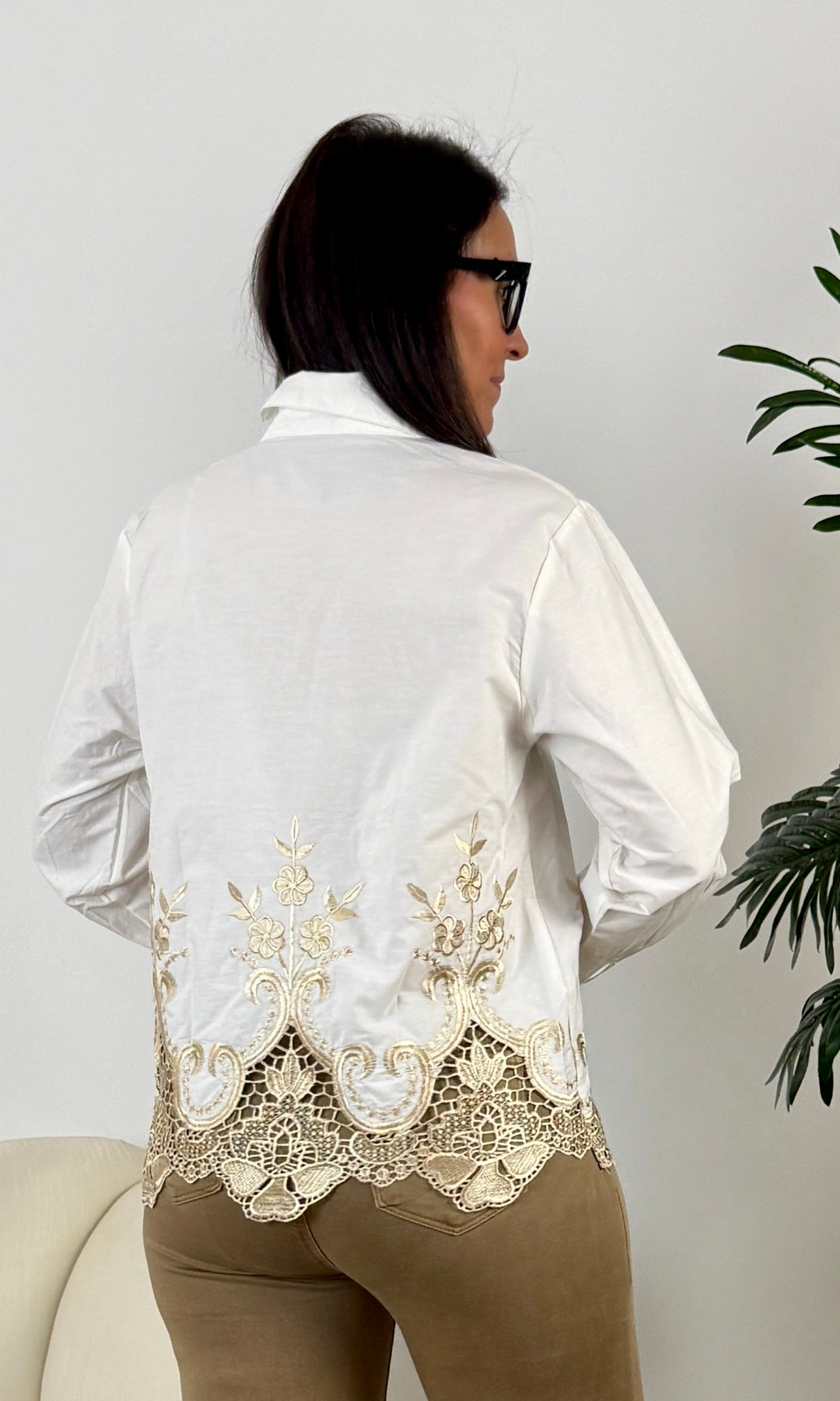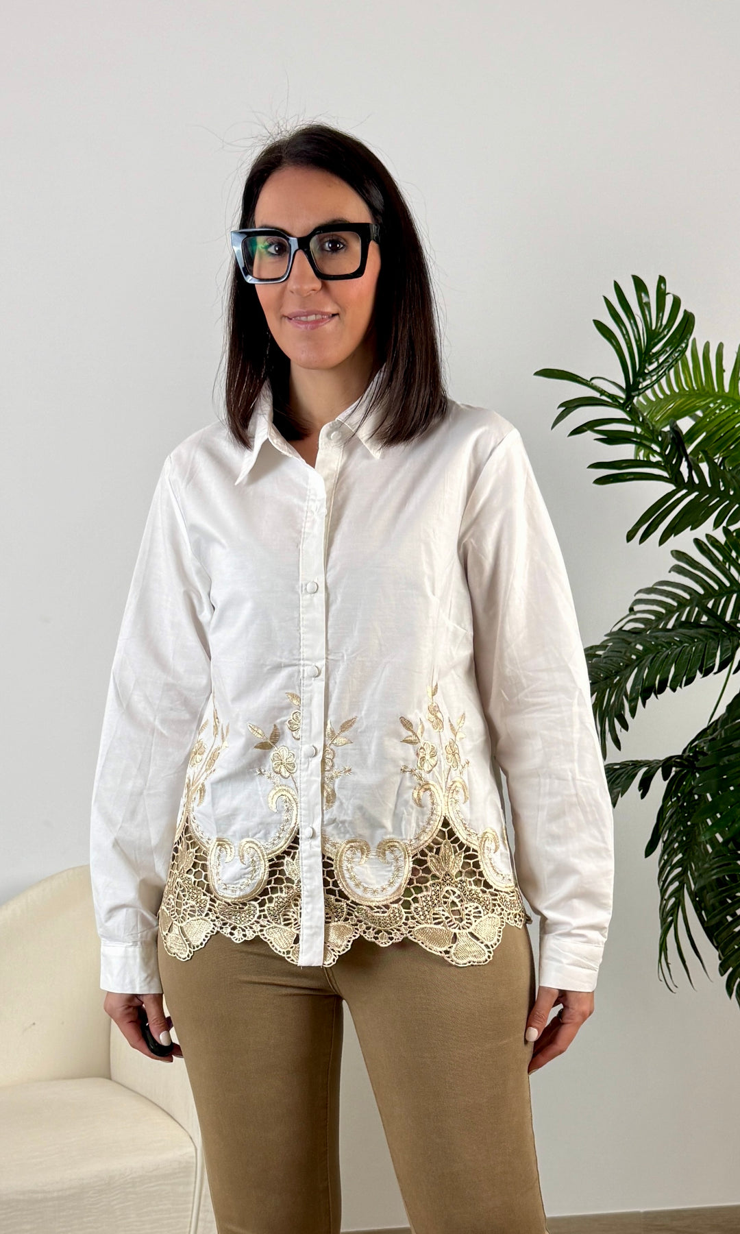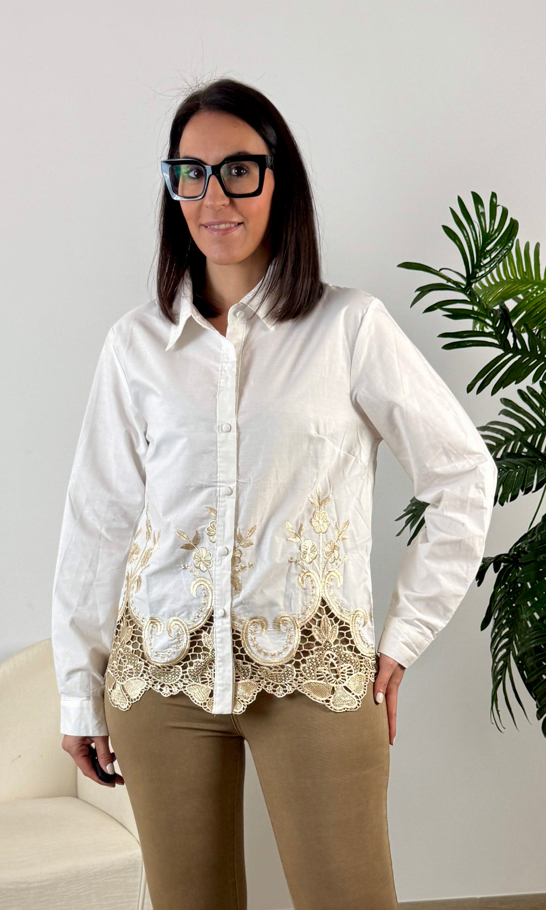 • Descubre nuestra exclusiva camisa de alta calidad en color blanca. Esta elegante prenda de manga larga presenta un diseño sofisticado con botones en el puño forrados, cierre central y cuello camisa. Decorada con encaje en la parte de abajo en color beige añadiendo un toque de glamour a tu estilo. Explora la distinción y la comodidad con nuestra colección de camisas premium.