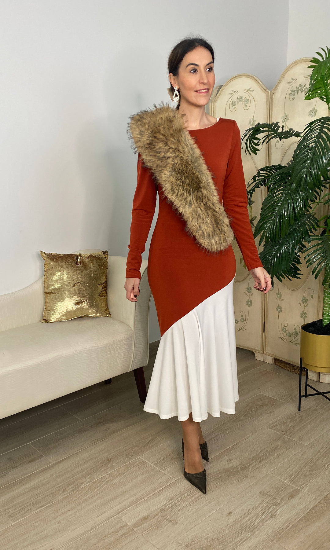 • Vestido de corte midi bicolor, blanco y teja de maga larga y cuello redondo delantero y escote pico trasero, va forrado y no transparenta. La falda es de corte capa.