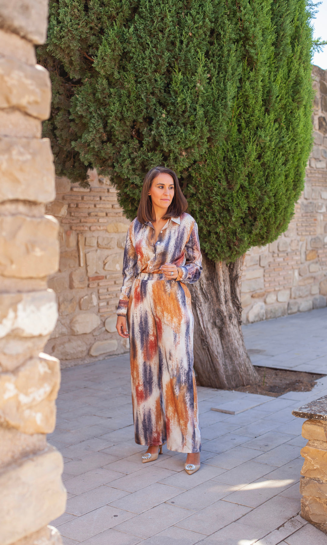 - Conjunto espectacular, confeccionado en un tejido fluido de gran caída. Su diseño en tonos tierra, azul y marfil con toques de cristales en la camisa crea un efecto sofisticado y moderno, ideal para tu día a día o de noche. Con cinturilla elástica definida y corte recto, estiliza la silueta y realza la feminidad con un toque chic y actual. Una prenda exclusiva para mujeres que buscan destacar con estilo.