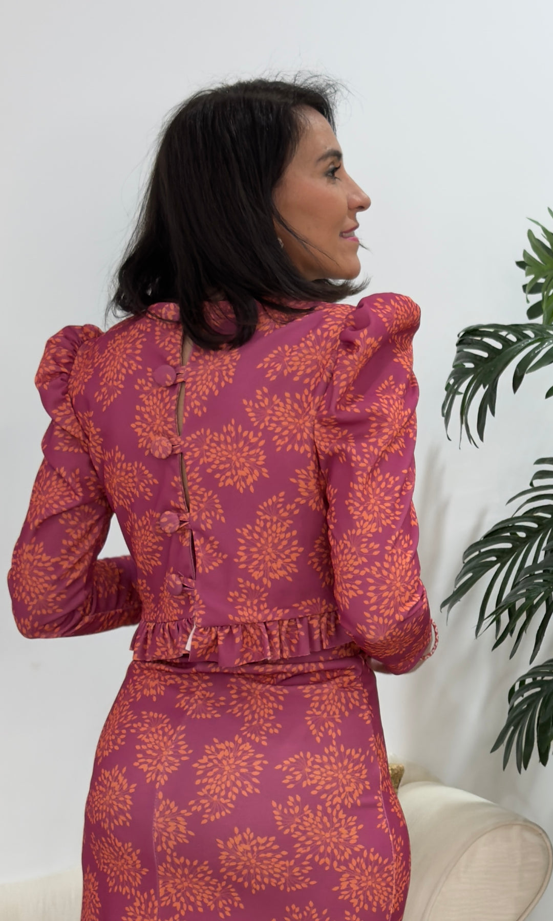- Su top de manga francesa con hombros abullonados y su falda con caída favorecedora crean una silueta estilizada y moderna. Su estampado floral lo convierte en la opción perfecta para eventos de día, cócteles o reuniones con un toque de distinción.