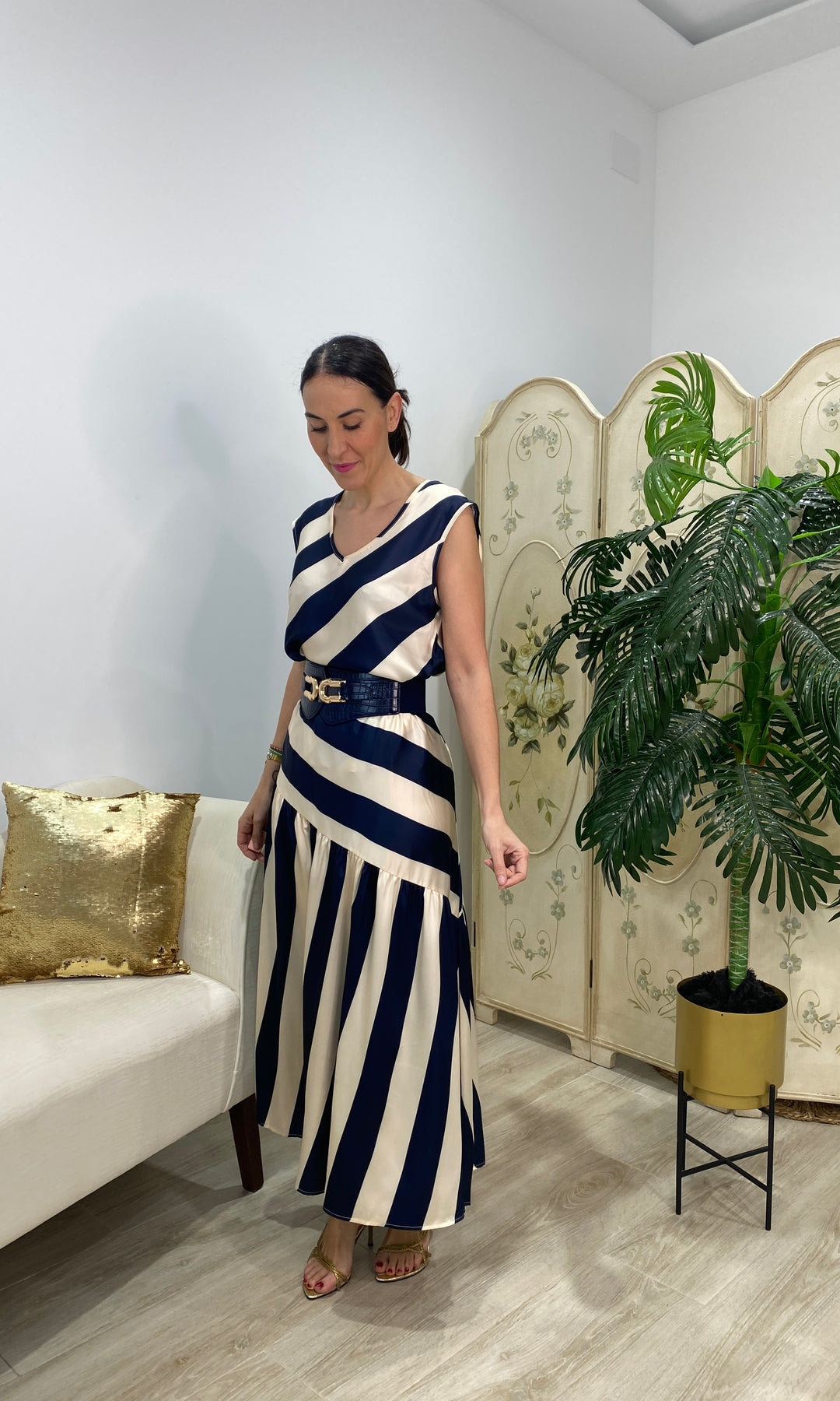 Conjunto de dos piezas con estampado de rayas, elegante y con mucho movimiento. Formado por top fluido sin mangas y falda midi con vuelo, que estiliza la figura y aporta un aire muy favorecedor. Un look cómodo pero con personalidad, perfecto para destacar.