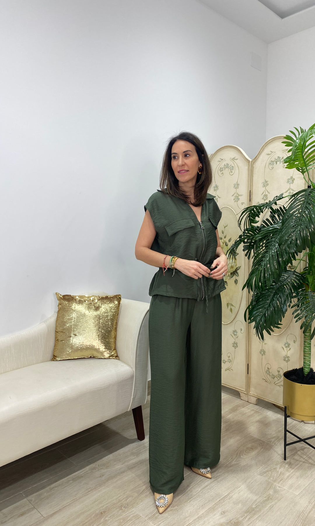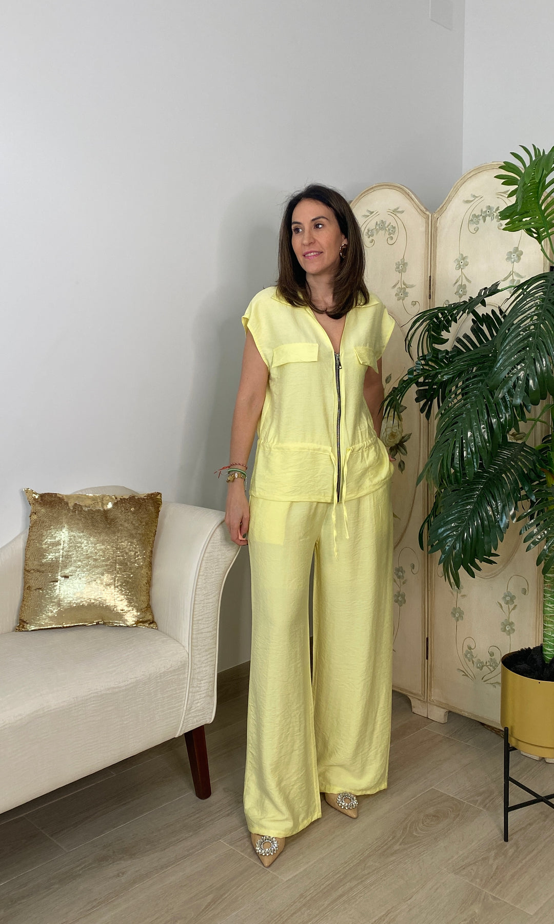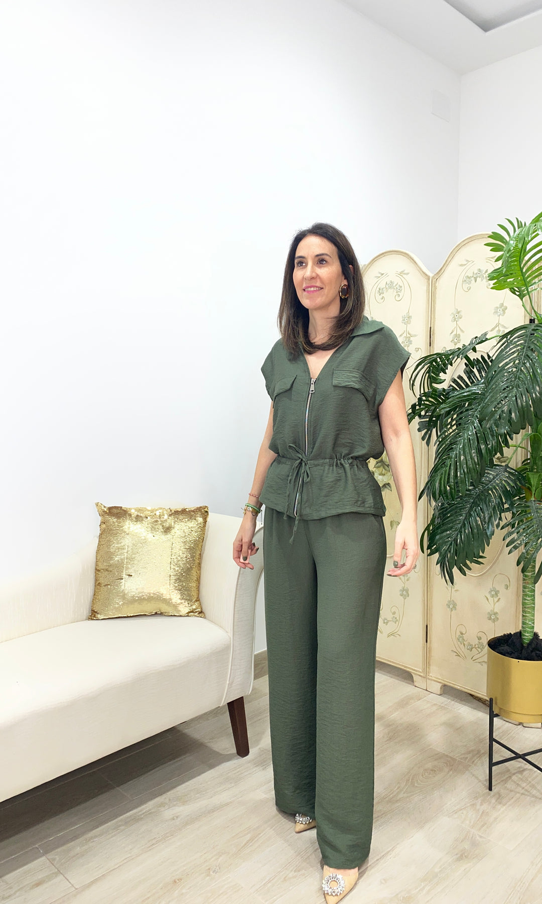Conjunto de dos piezas, cómodo y con mucho estilo. Incluye blusa con cremallera, bolsillos y cintura ajustable que estiliza la figura, junto a un pantalón fluido de corte amplio que aporta movimiento y confort. Su tejido ligero lo convierte en una opción ideal para el día a día. Perfecto para looks casual elegantes, viajar o ir arreglada sin complicarte.