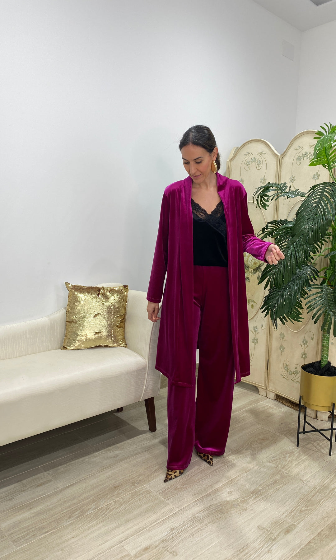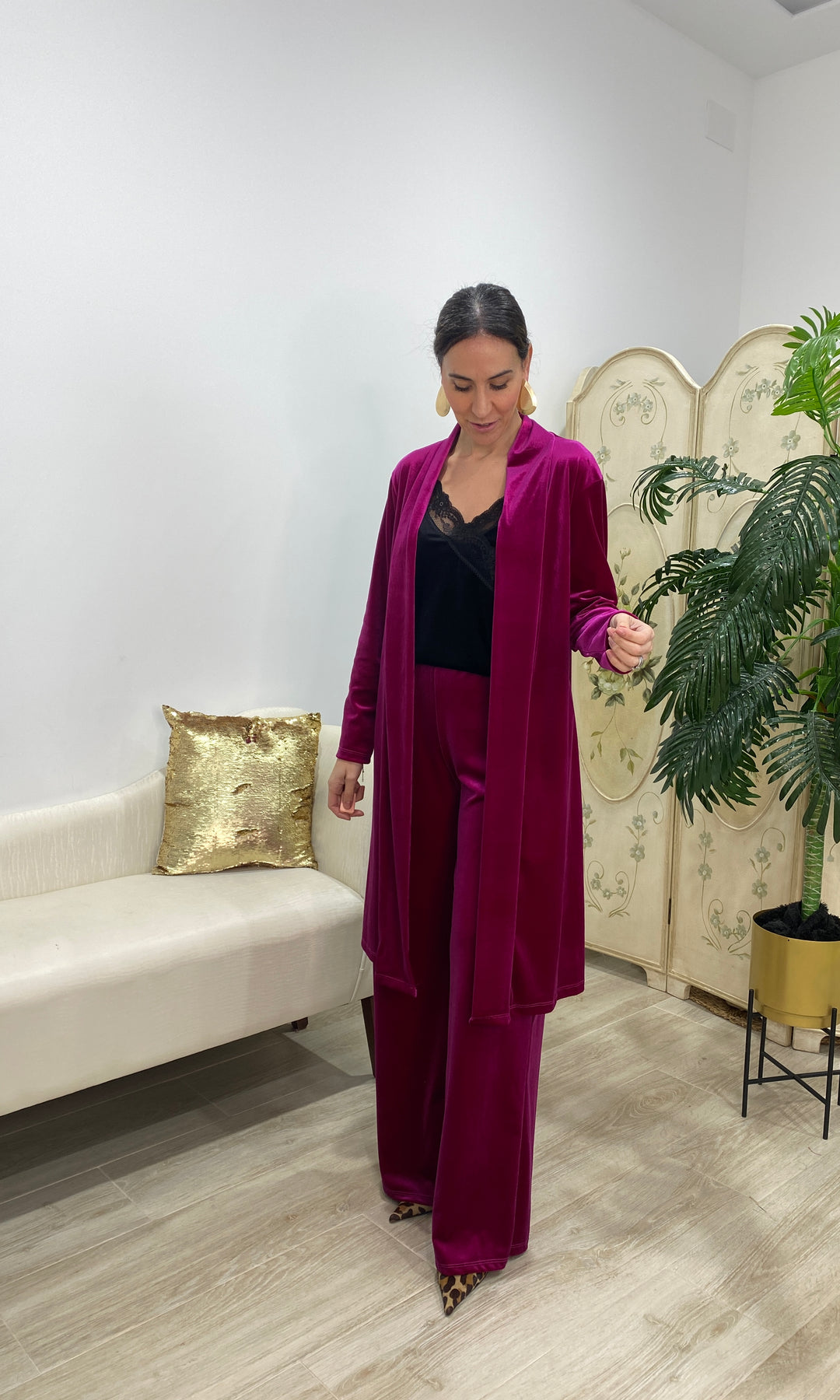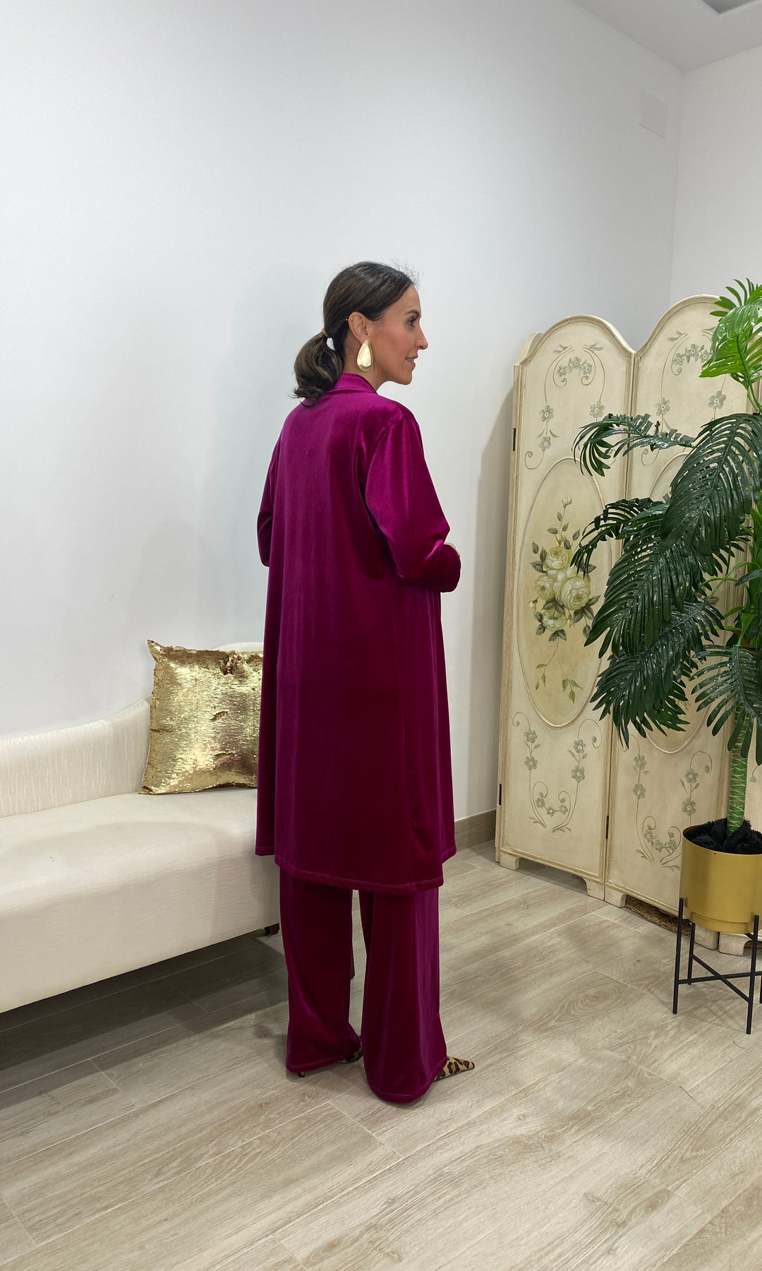• Conjunto de terciopelo suave, formado por chaqueta larga fluida y pantalón de corte recto. Elegante, cómodo y muy favorecedor, es perfecto para eventos, cenas especiales o para vestir con estilo en ocasiones especiales sin renunciar al confort.