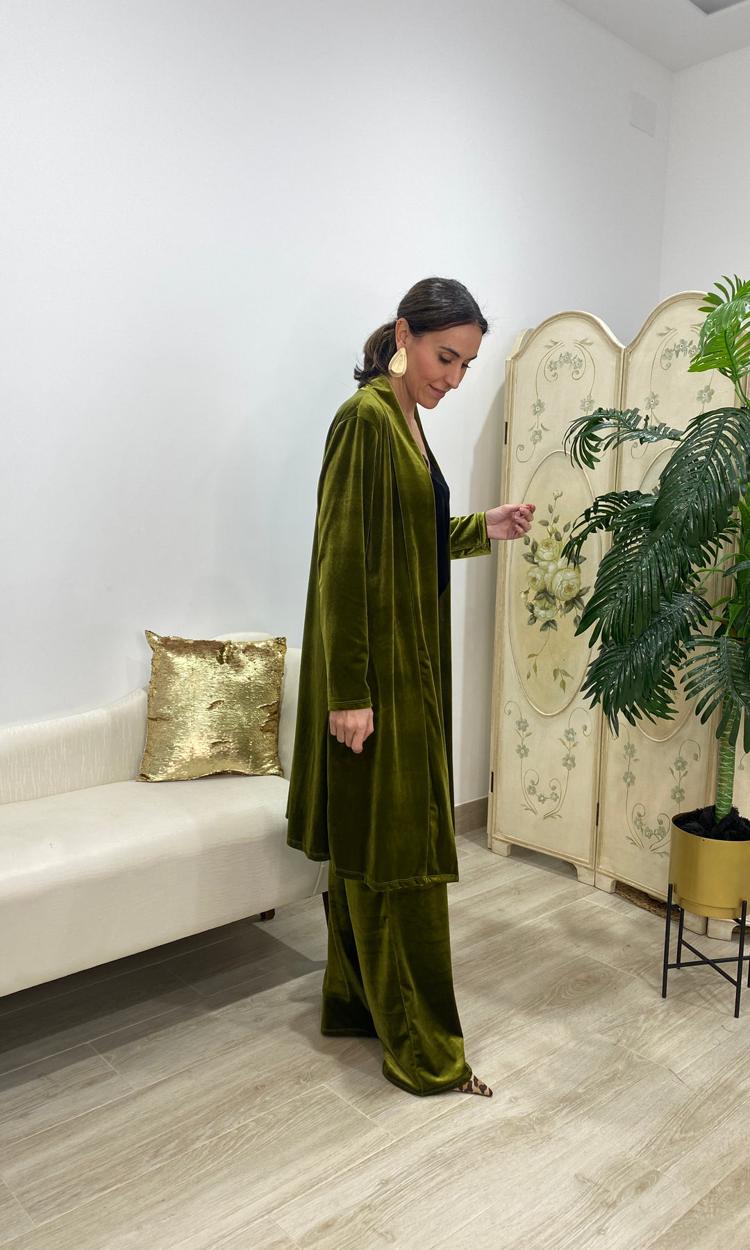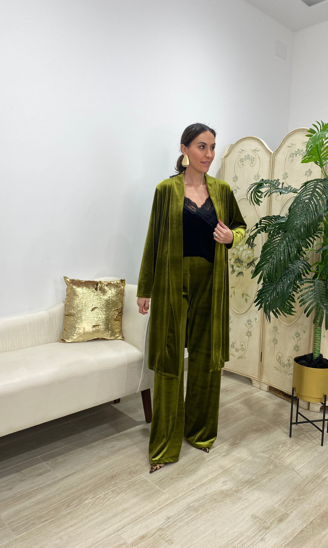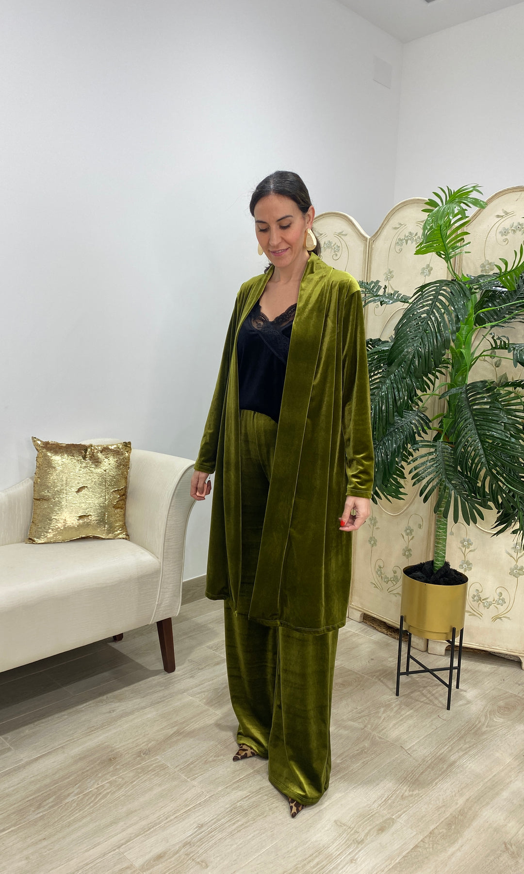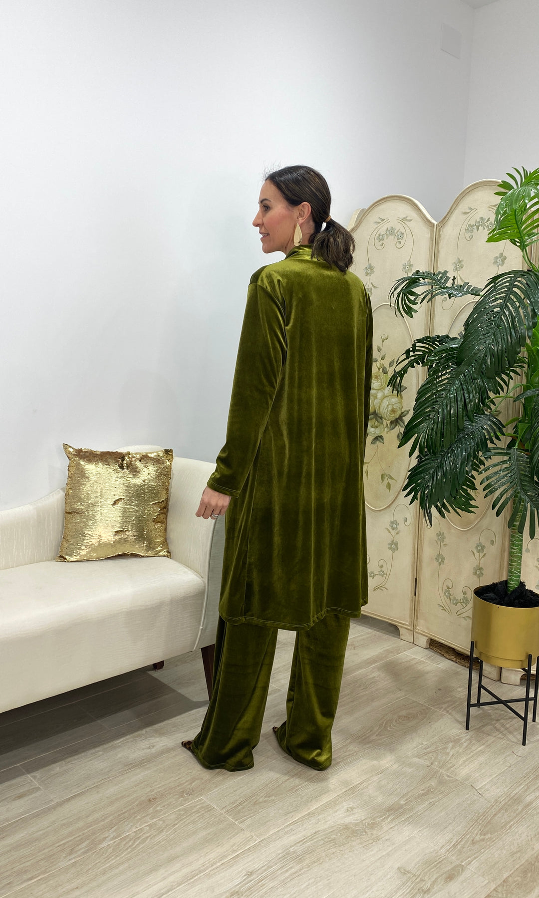 • Conjunto de terciopelo suave, formado por chaqueta larga fluida y pantalón de corte recto. Elegante, cómodo y muy favorecedor, es perfecto para eventos, cenas especiales o para vestir con estilo en ocasiones especiales sin renunciar al confort.