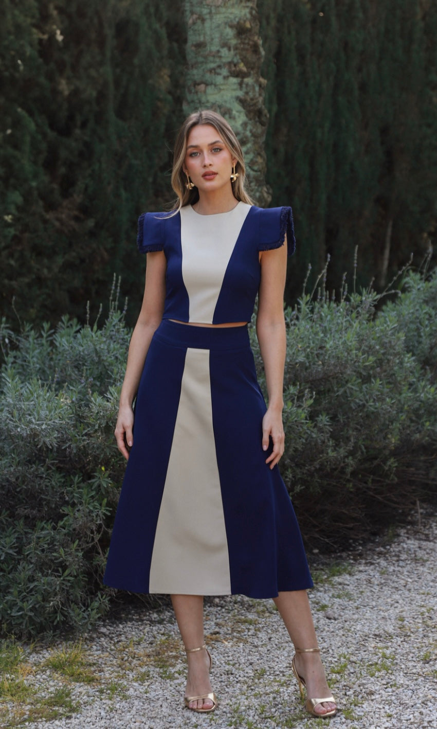 - Conjunto perfecto para invitada de boda y eventos. Top y falda en tejido bioelástico. Falda de capa bicolor con cremallera lateral. Top bicolor con detalle flecos en solapas.