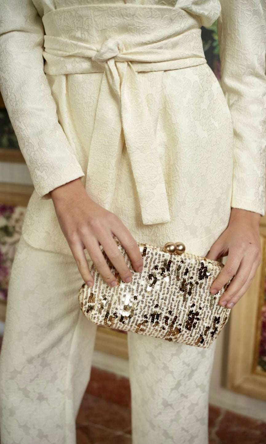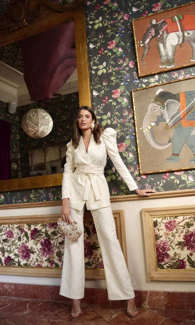 El traje Carey está confeccionado en tejido jacquard. La chaqueta cruzada con lazada estiliza la figura. La manga abullonada y la hombrera aportan estructura y presencia. El pantalón recto equilibra el conjunto y alarga la silueta.