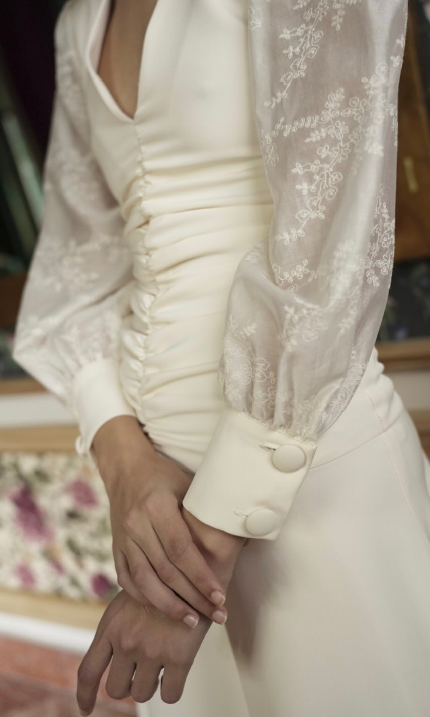 El Vestido Mara está confeccionado en tejido bioelástico con voile bordado , aportando comodidad y una caída elegante. Su drapeado central, corte a la cadera y escote en V estilizan la silueta, mientras que la cremallera trasera y el forro interior garantizan un ajuste perfecto.