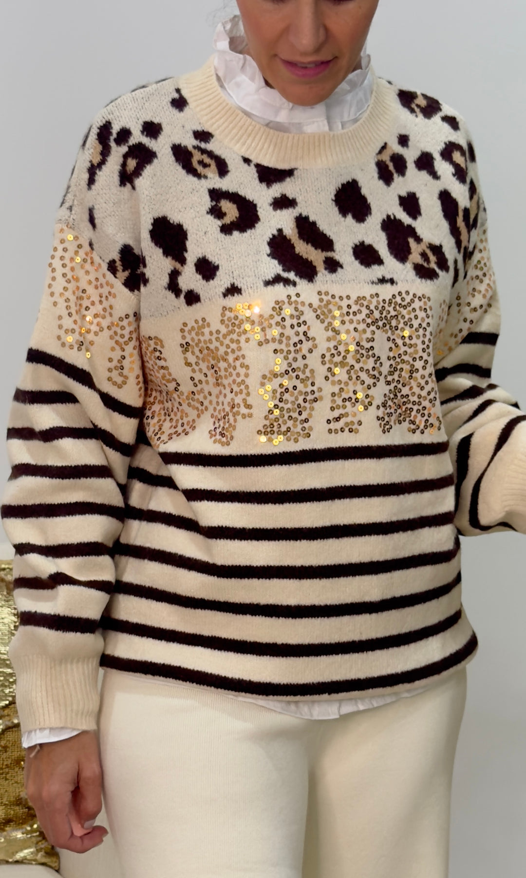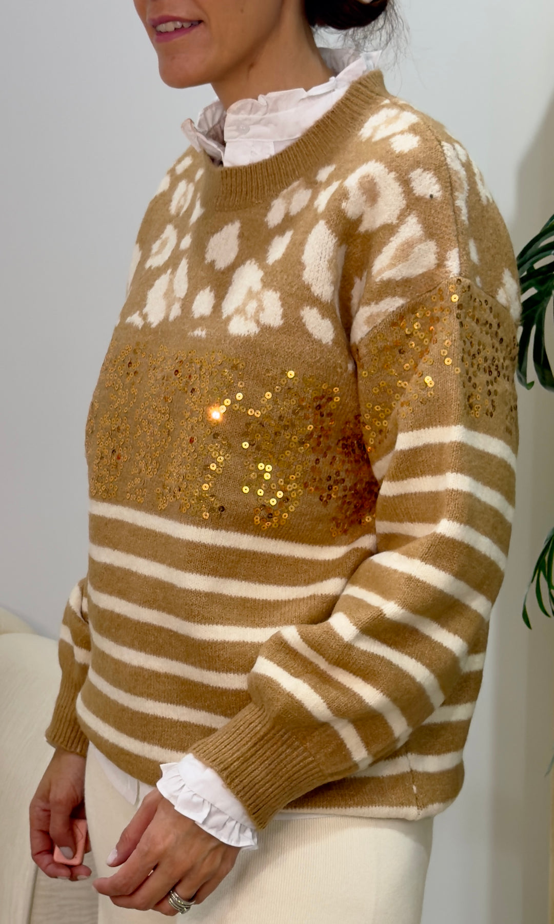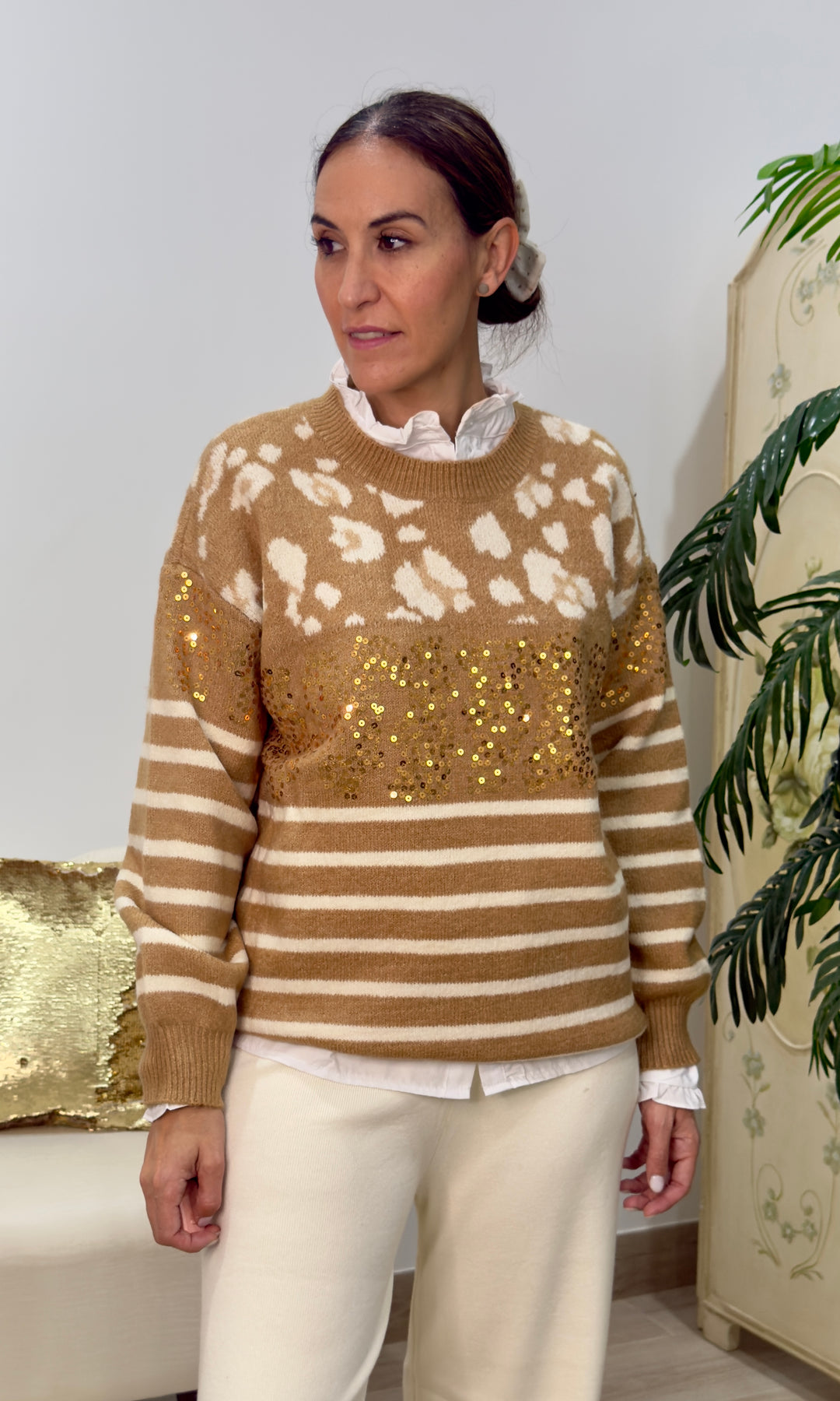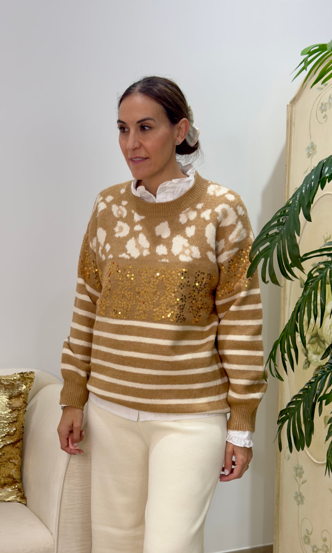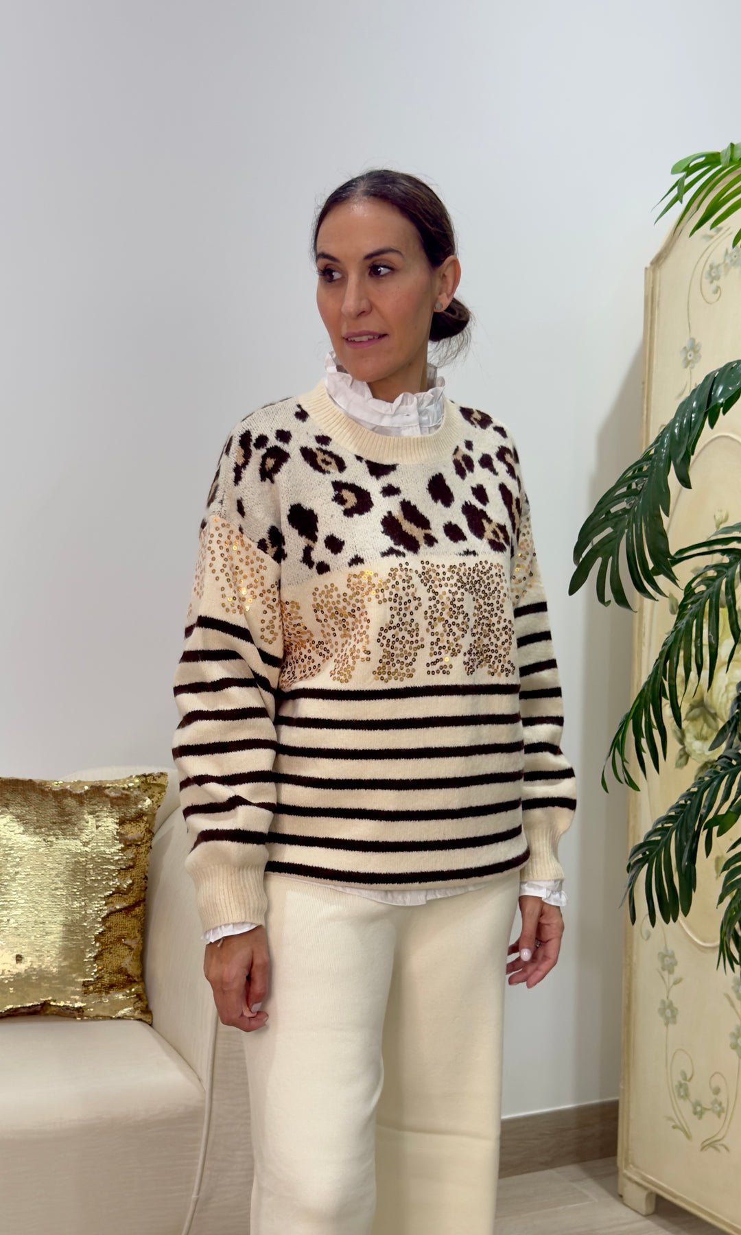 Descubre nuestro jersey de punto con estampado animal print y rayas, una prenda única que combina moda, comodidad y estilo en cada detalle. Su diseño en tonos crema y marrón, junto con las aplicaciones brillantes en la parte central, lo convierten en un jersey original y lleno de personalidad, ideal para mujeres que buscan destacar sin renunciar al confort. Confeccionado en un tejido suave, cálido y de alta calidad, este jersey es perfecto para los días fríos. Su cuello redondo, las mangas ligeramente abullonadas y su corte favorecedor aportan un toque moderno y chic a cualquier look. Combínalo con pantalones de punto, denim o faldas para crear conjuntos casuales o más arreglados.