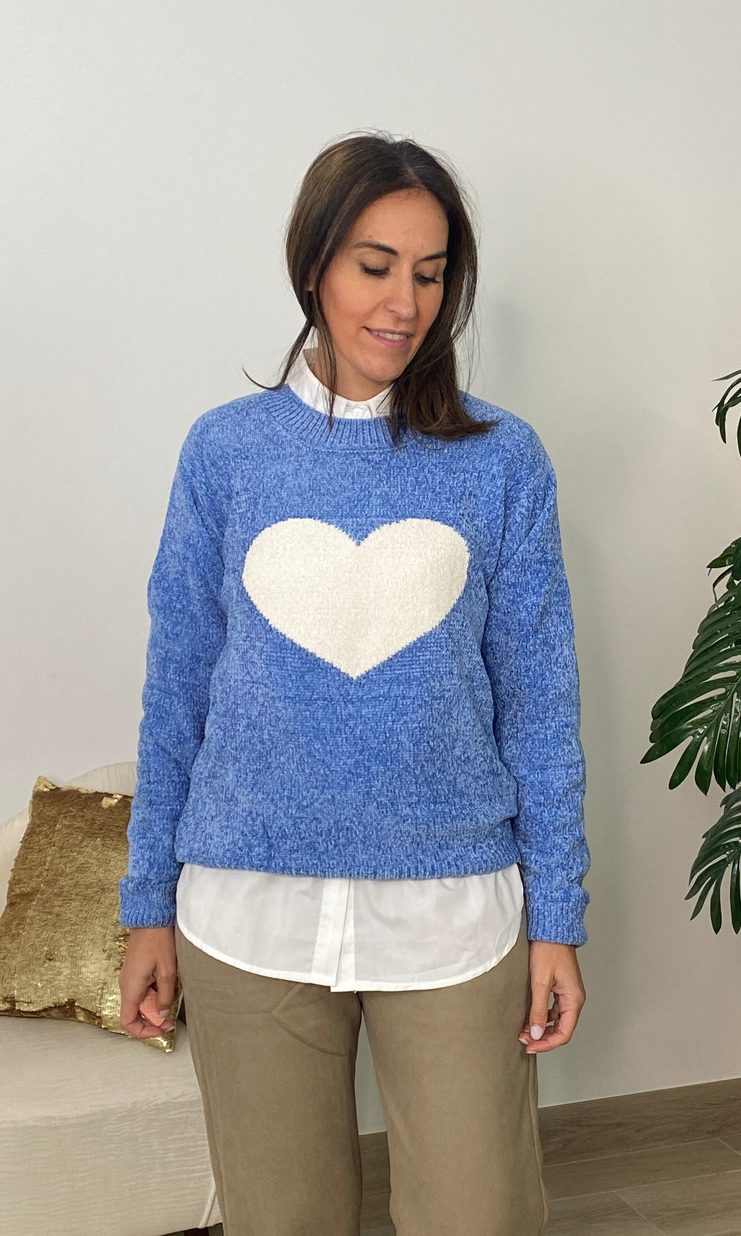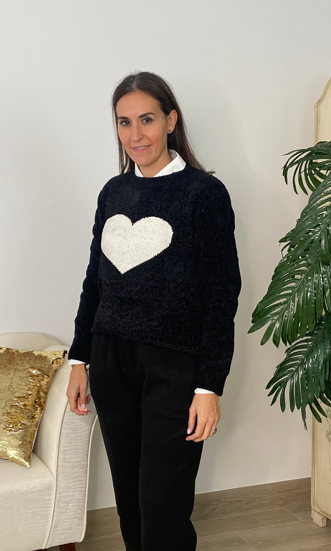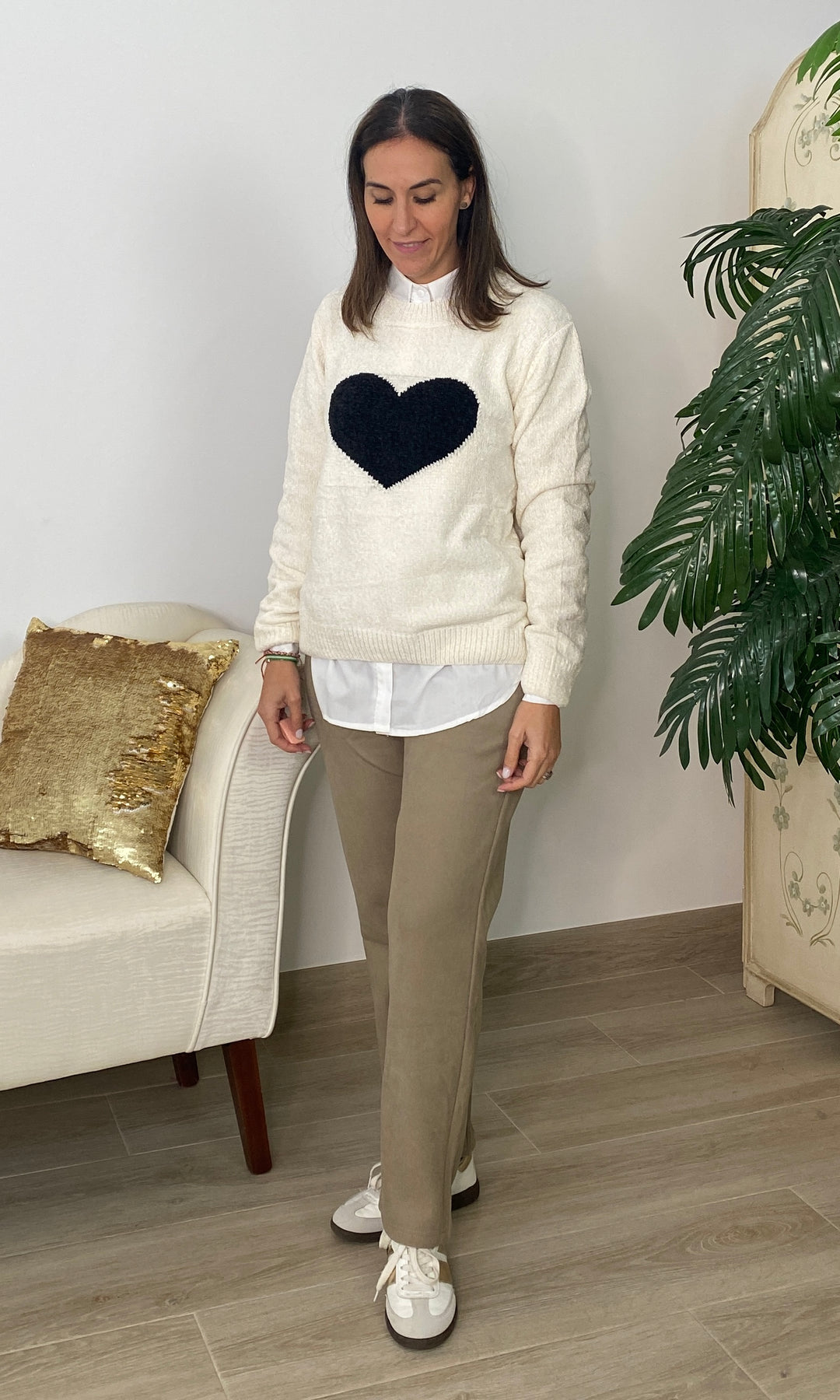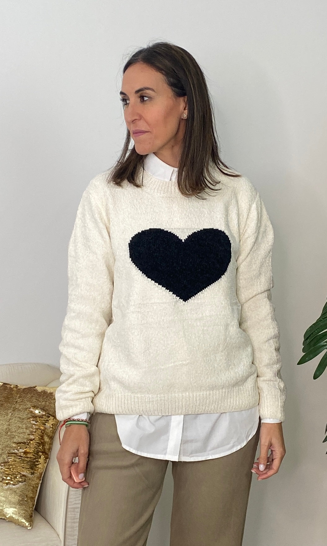 • Añade un toque dulce y atemporal a tus looks con nuestro jersey con corazón blanco, una prenda de punto suave perfecta para el día a día. Su diseño favorece a todos los tonos de piel, mientras que el corazón central en relieve aporta un detalle tierno y luminoso que lo convierte en una pieza especial y muy combinable. Su textura cálida y confortable lo hace ideal para la temporada de otoño e invierno, ofreciendo un ajuste cómodo gracias a su corte recto, su cuello redondo y su tejido agradable al tacto. Es perfecto para llevar con camisa debajo, como en la foto, o para crear looks más casuales con vaqueros o pantalones fluidos.
