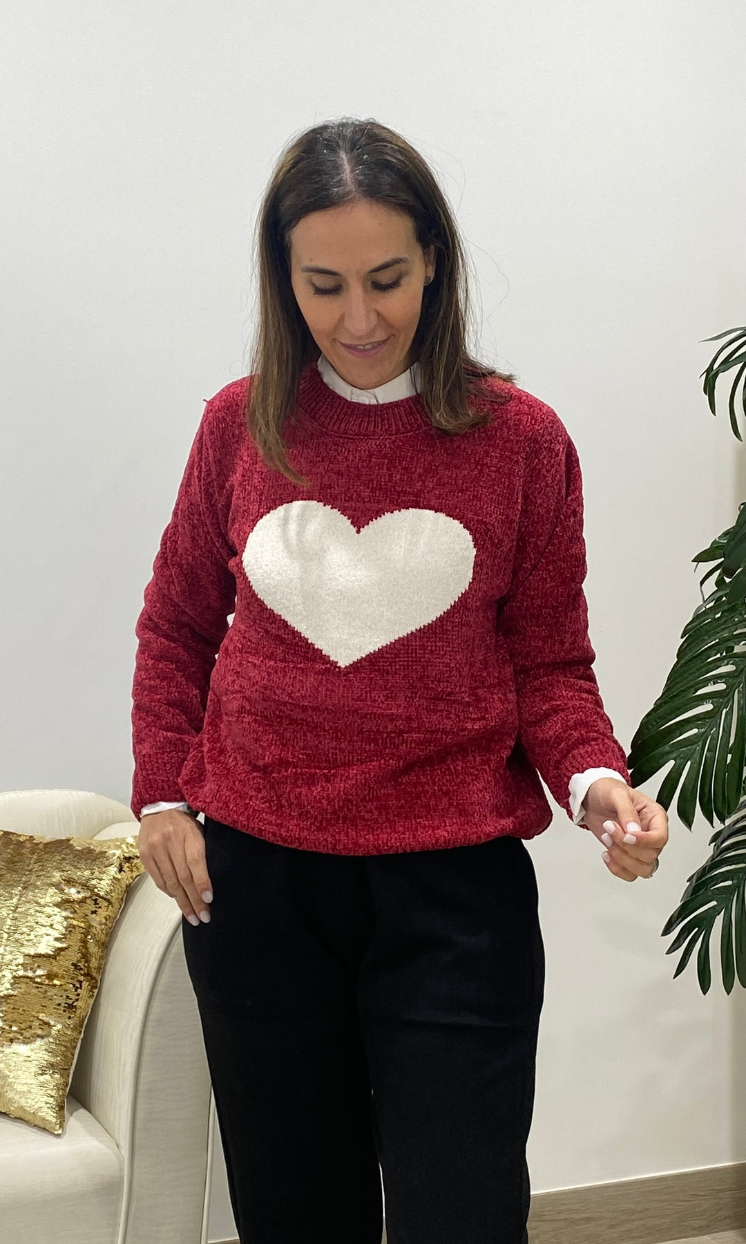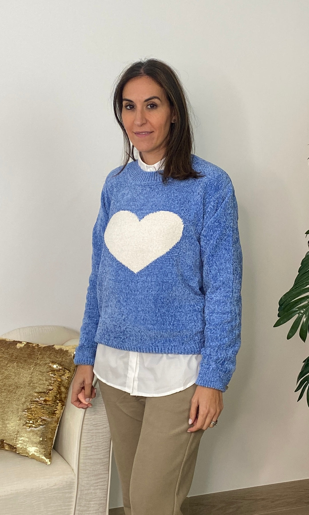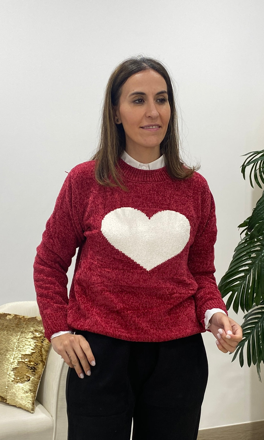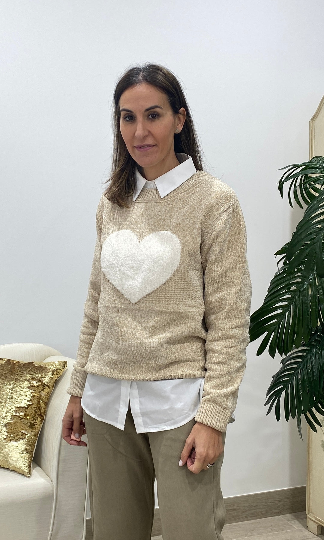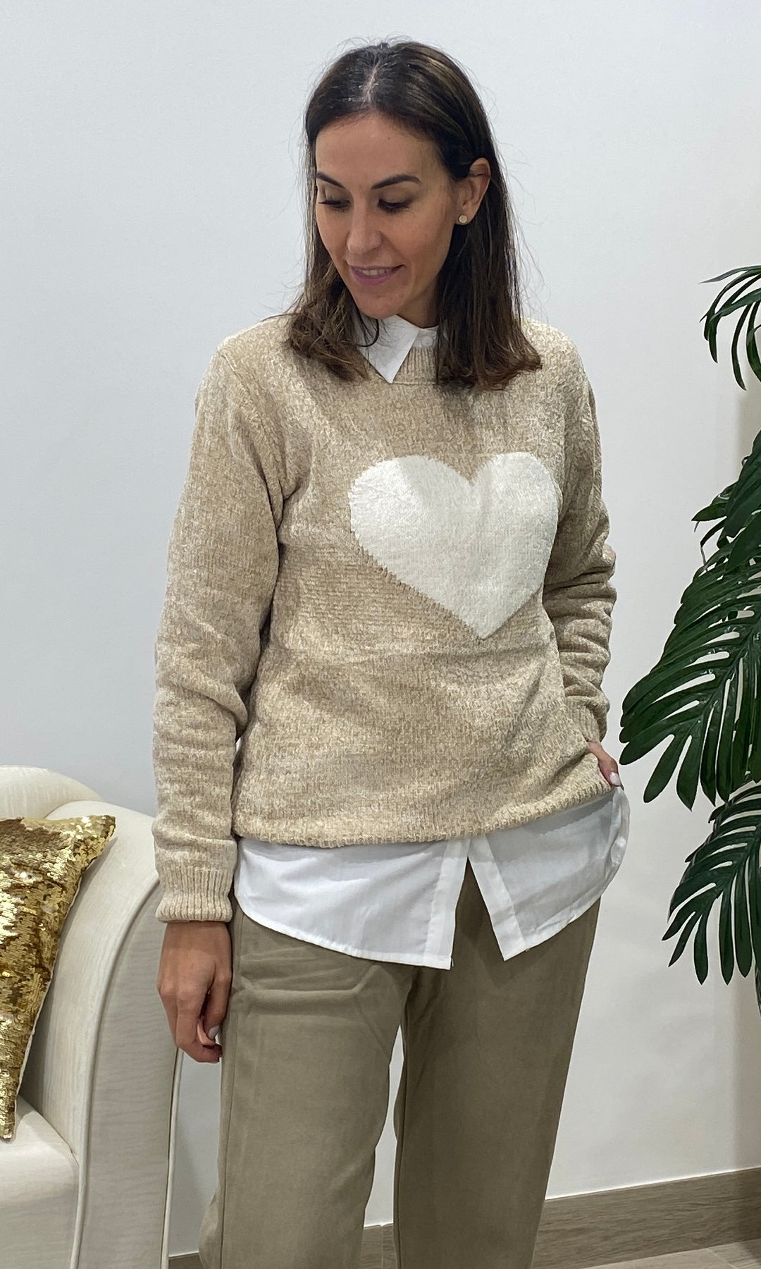 • Añade un toque dulce y atemporal a tus looks con nuestro jersey con corazón blanco, una prenda de punto suave perfecta para el día a día. Su diseño favorece a todos los tonos de piel, mientras que el corazón central en relieve aporta un detalle tierno y luminoso que lo convierte en una pieza especial y muy combinable. Su textura cálida y confortable lo hace ideal para la temporada de otoño e invierno, ofreciendo un ajuste cómodo gracias a su corte recto, su cuello redondo y su tejido agradable al tacto. Es perfecto para llevar con camisa debajo, como en la foto, o para crear looks más casuales con vaqueros o pantalones fluidos.