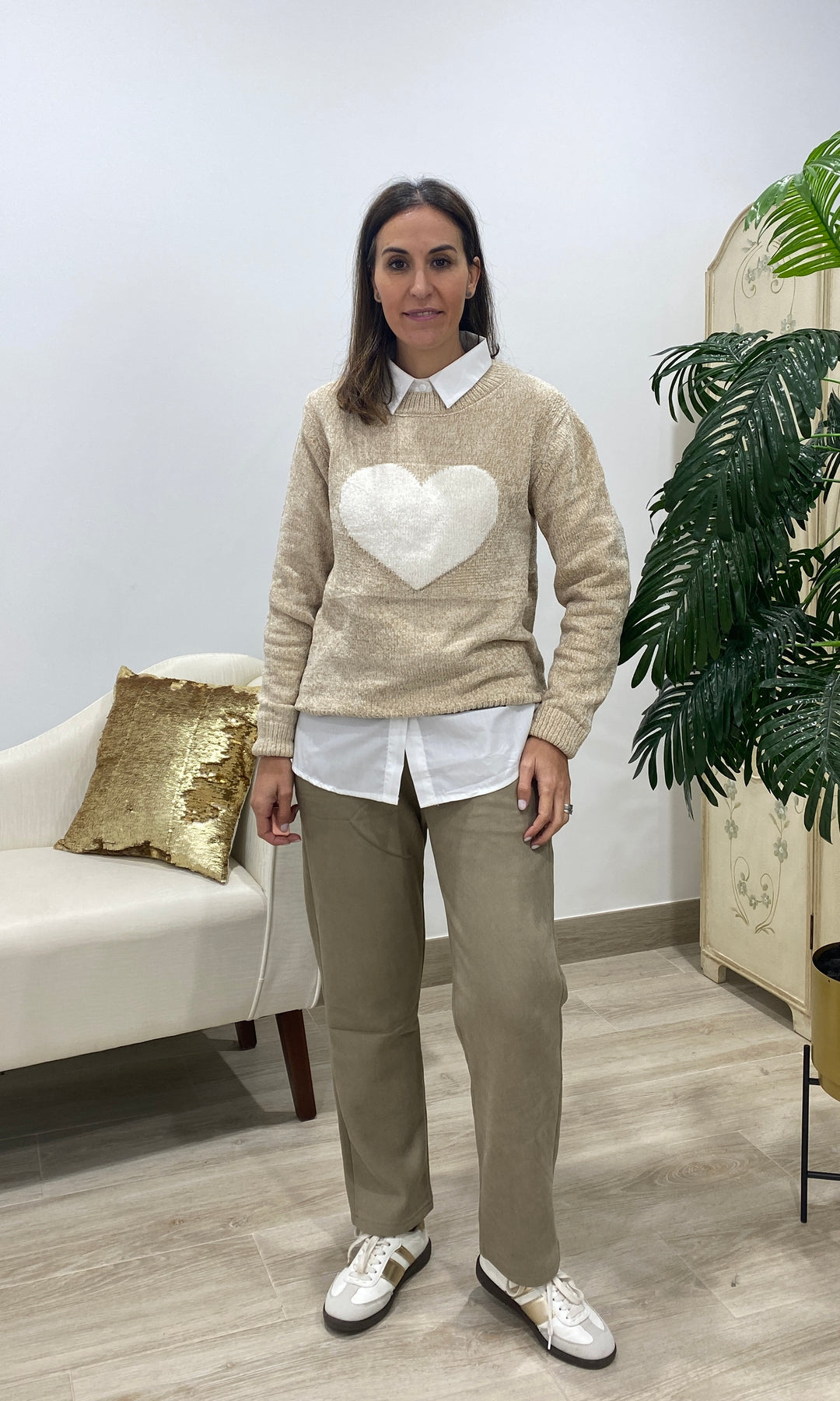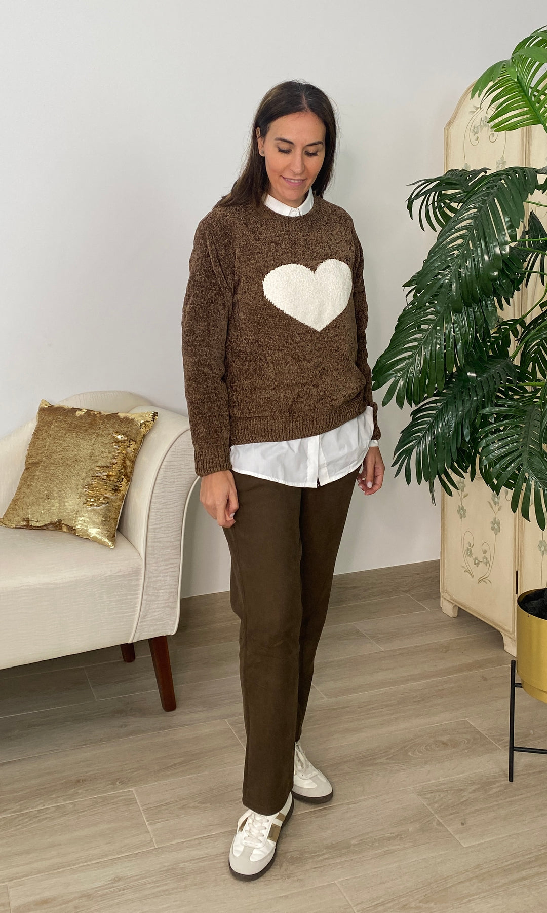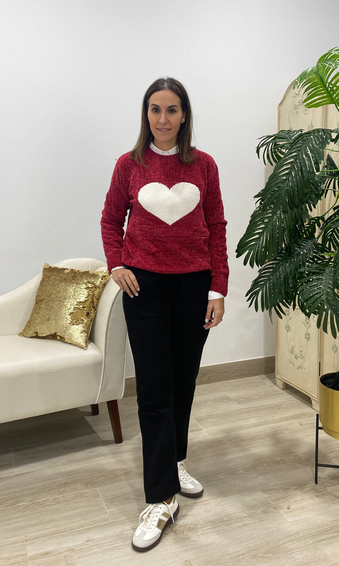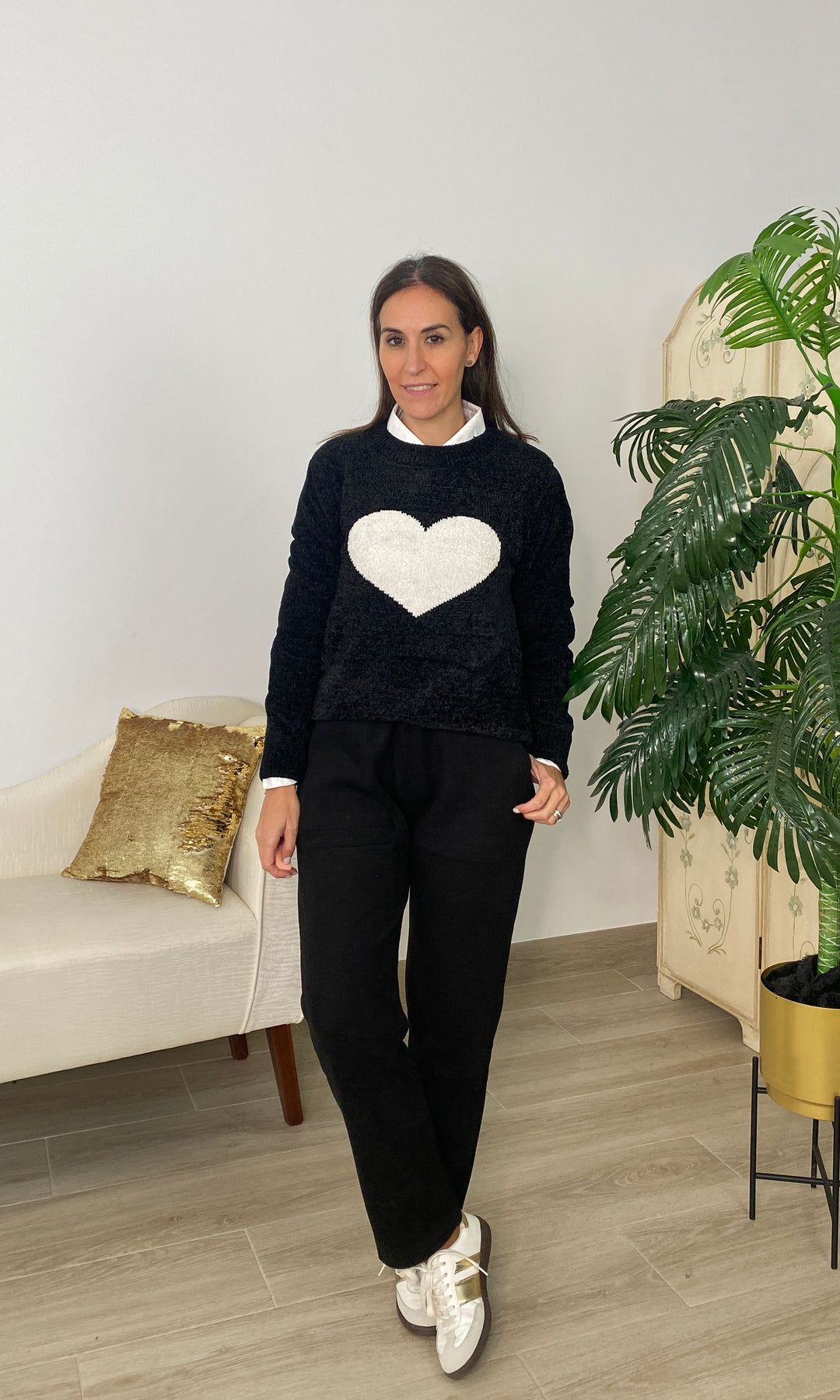 • Añade un toque dulce y atemporal a tus looks con nuestro jersey con corazón blanco, una prenda de punto suave perfecta para el día a día. Su diseño favorece a todos los tonos de piel, mientras que el corazón central en relieve aporta un detalle tierno y luminoso que lo convierte en una pieza especial y muy combinable. Su textura cálida y confortable lo hace ideal para la temporada de otoño e invierno, ofreciendo un ajuste cómodo gracias a su corte recto, su cuello redondo y su tejido agradable al tacto. Es perfecto para llevar con camisa debajo, como en la foto, o para crear looks más casuales con vaqueros o pantalones fluidos.