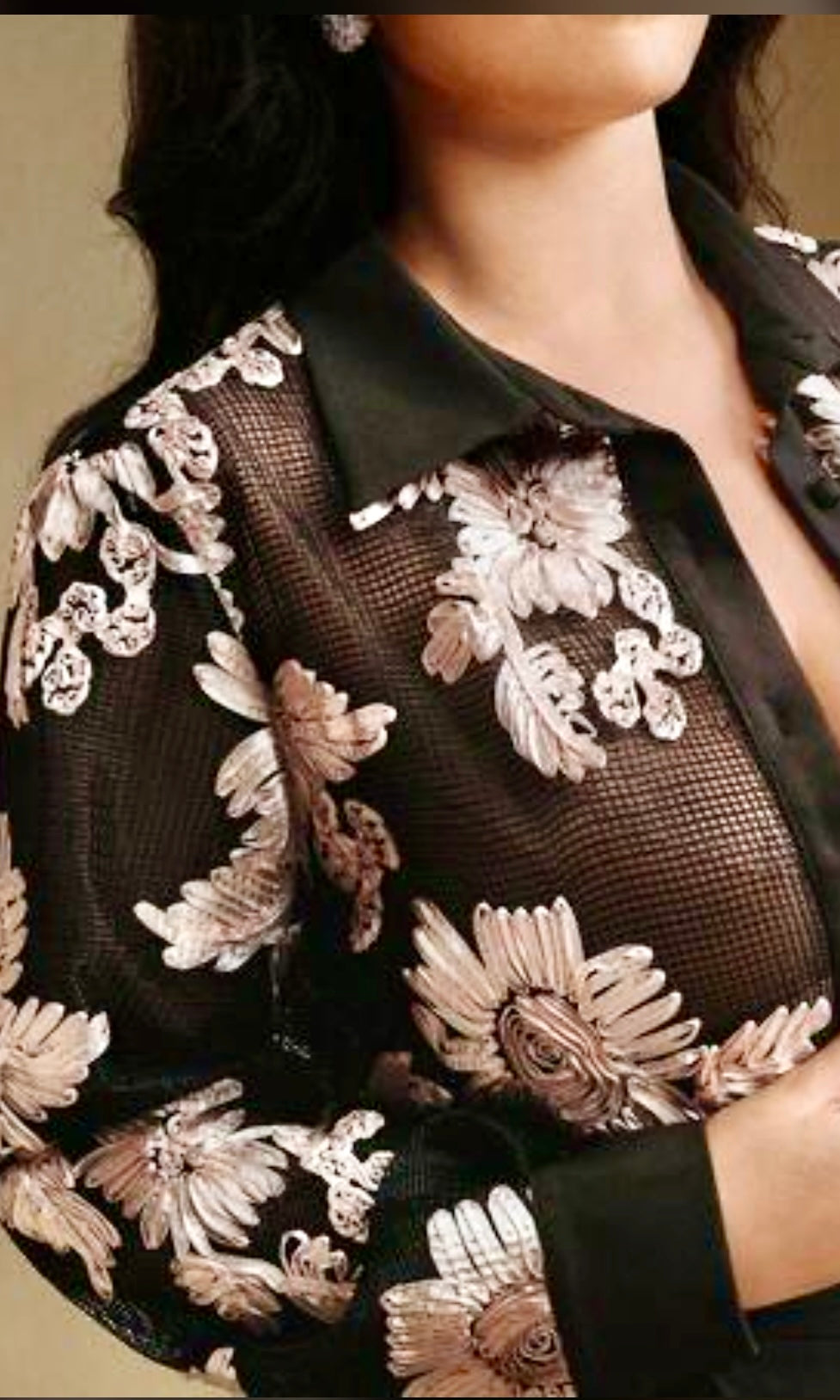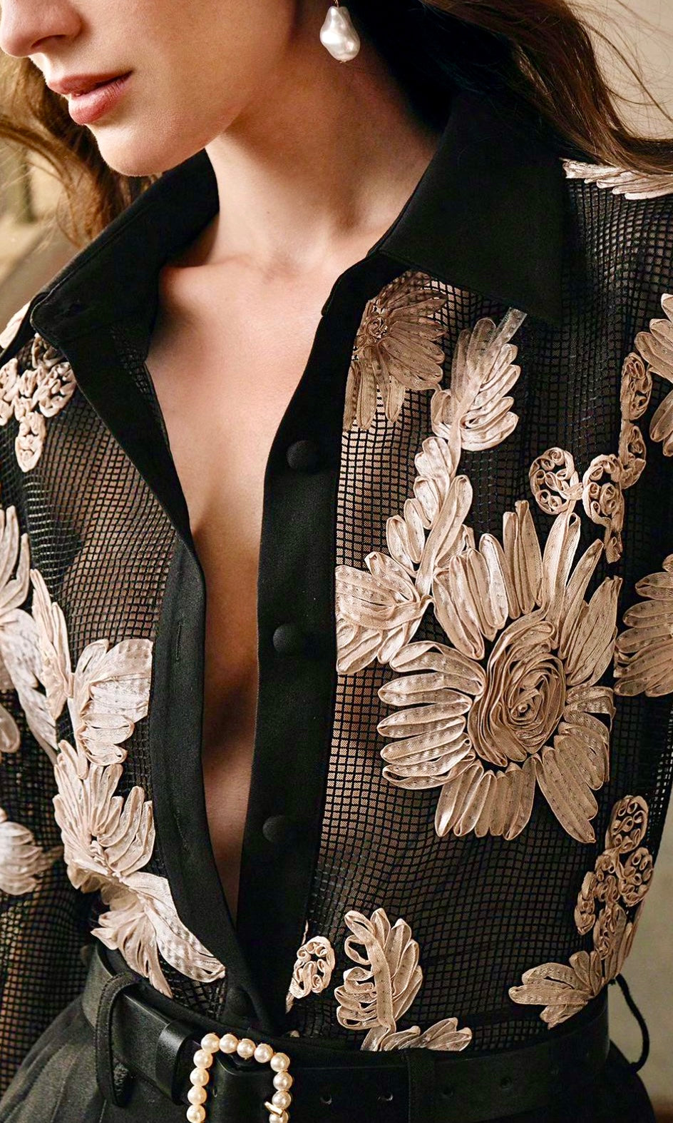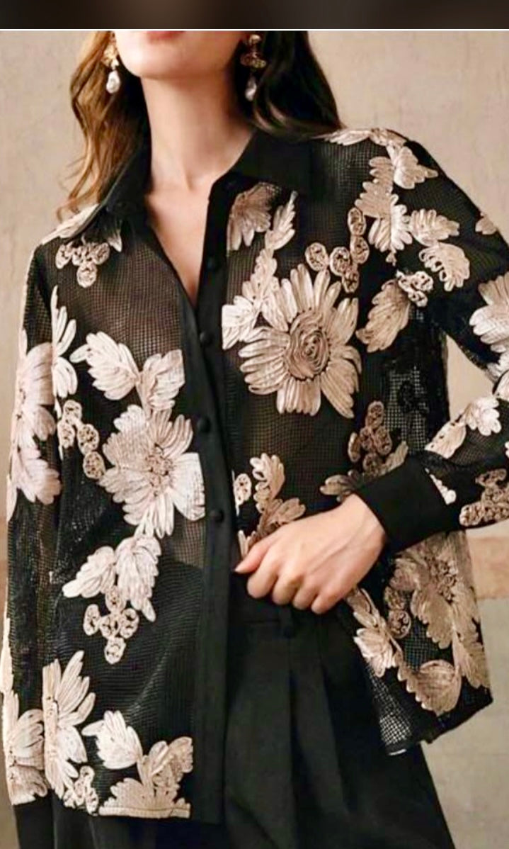 • Esta camisa negra para mujer es una auténtica joya. Confeccionada en un delicado tejido de rejilla y adornada con bordados florales en relieve en tonos suaves, es una prenda especial que marca la diferencia desde el primer vistazo. Cierra con botones centrales forrados tiene un acabado cuidado que aporta ese aire cómodo ideal para ocasiones especiales. Es perfecto para llevar con falda, pantalón de vestir o incluso con vaquero si quieres darle un punto más actual. Una camisa elegante, distinta y con mucha personalidad, pensada para mujeres que buscan piezas únicas y con estilo propio.