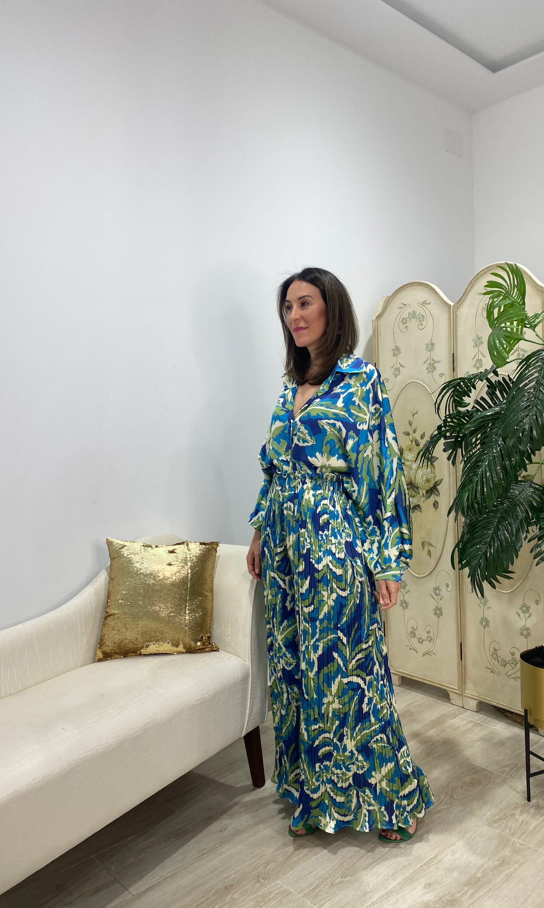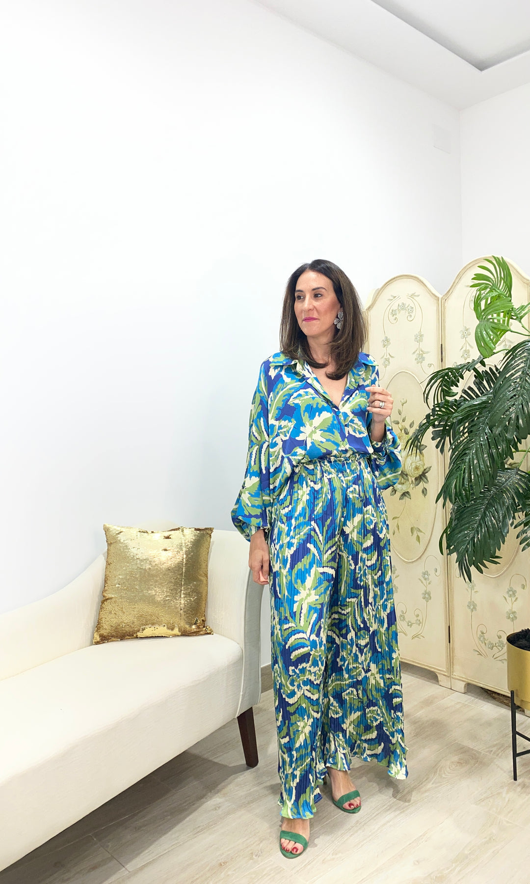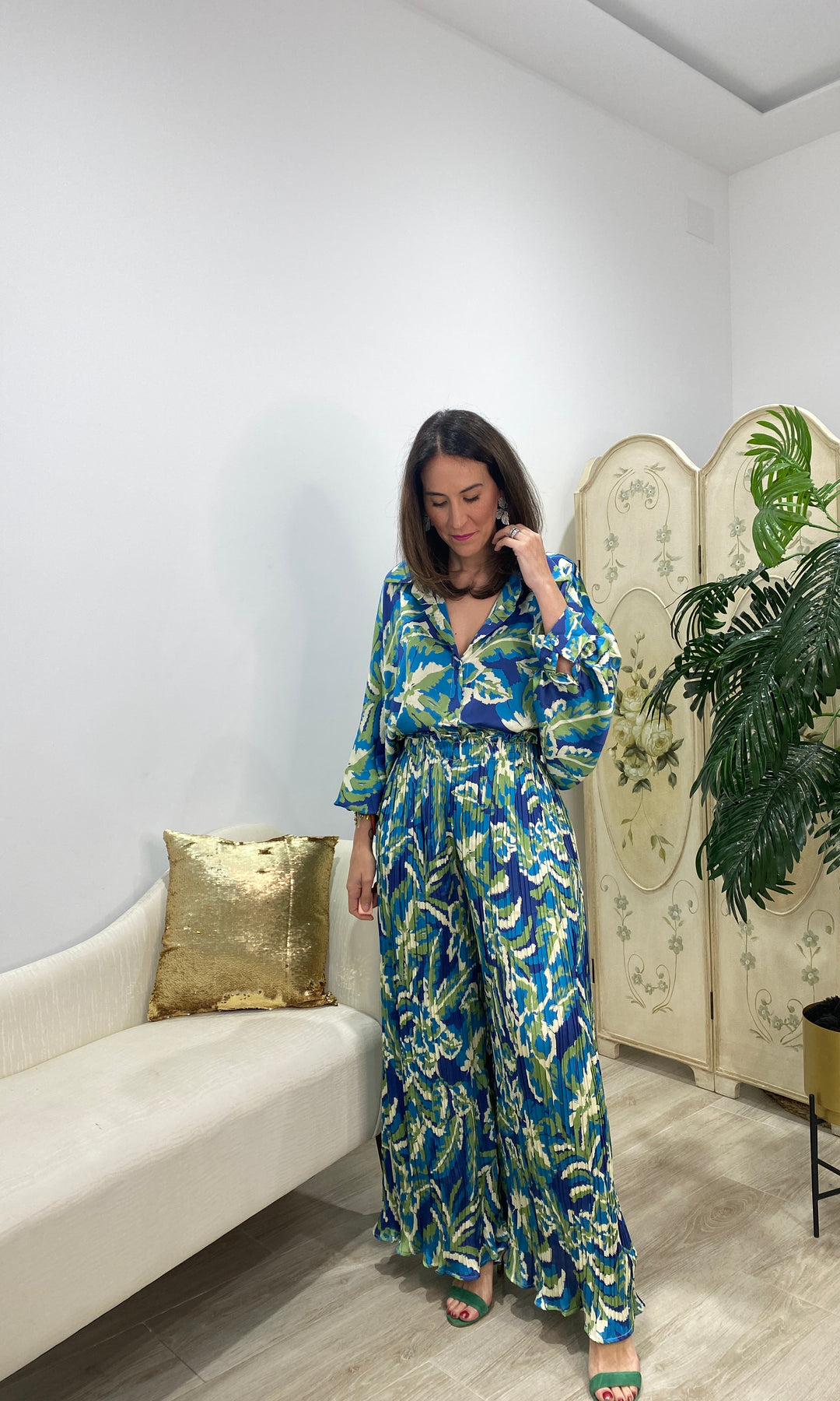 Conjunto estampado fluido para mujer que combina estilo y comodidad en una sola prenda. Su blusa de manga larga con botones centrales forrados es muy favorecedora de corte amplio, la cintura del pantalón es de goma elástica que se une a un pantalón plisado, amplio de caída ligera, creando un look elegante y muy versátil. Perfecto tanto para eventos como para el día a día, este conjunto estiliza y aporta movimiento. Ideal para mujeres que buscan ir arregladas sin renunciar a la comodidad.