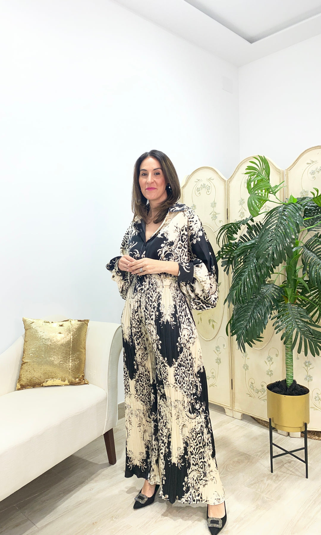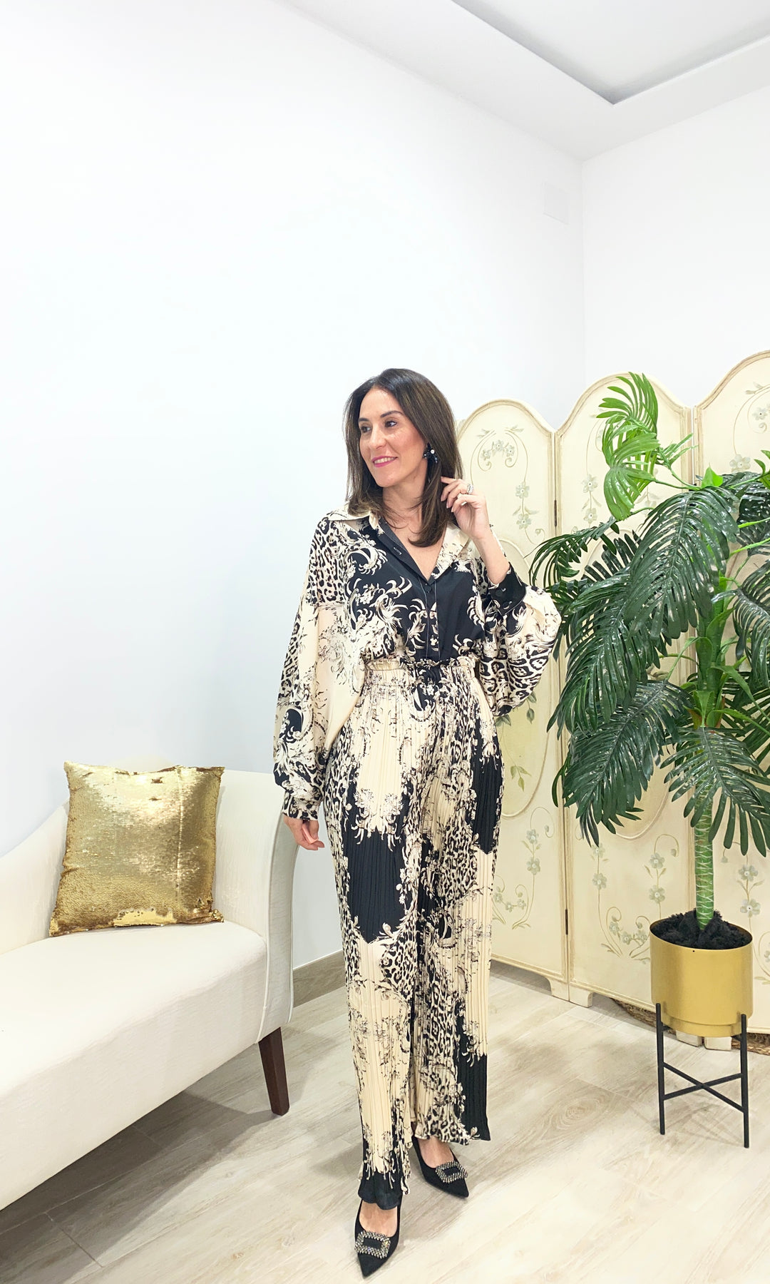Conjunto estampado fluido para mujer que combina estilo y comodidad en una sola prenda. Su blusa de manga larga con botones centrales forrados es muy favorecedora de corte amplio, la cintura del pantalón es de goma elástica que se une a un pantalón plisado, amplio de caída ligera, creando un look elegante y muy versátil. Perfecto tanto para eventos como para el día a día, este conjunto estiliza y aporta movimiento. Ideal para mujeres que buscan ir arregladas sin renunciar a la comodidad.