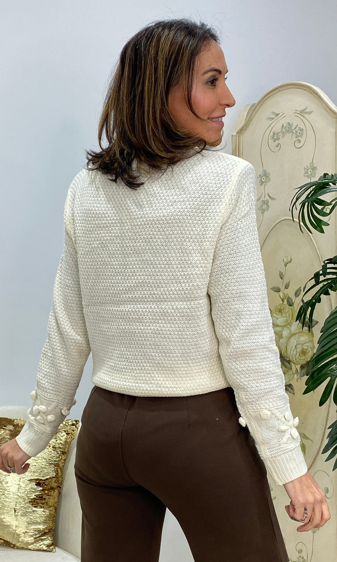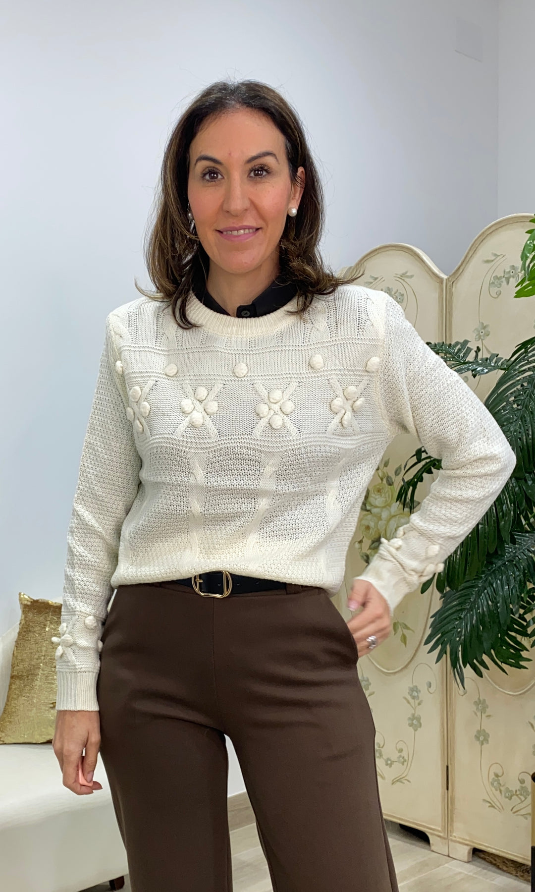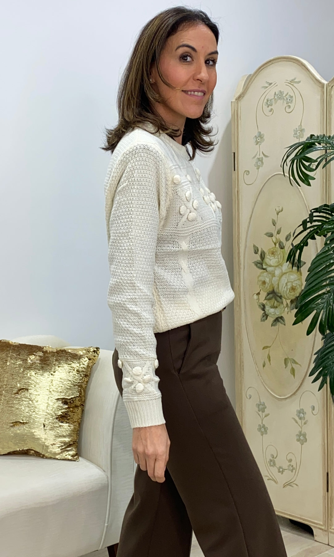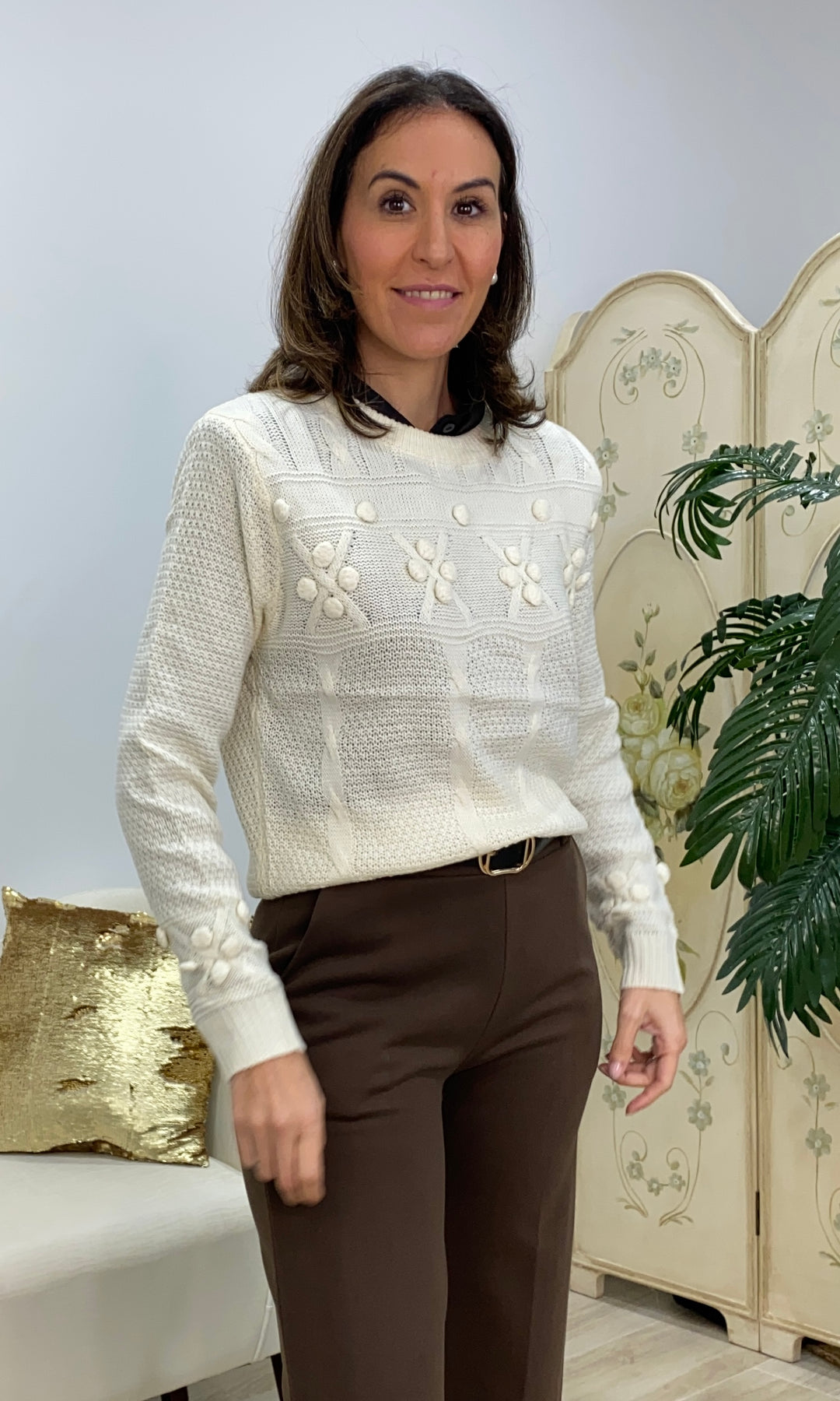 • Este jersey blanco de punto es de esos que enamoran a primera vista, pero que conquistan de verdad cuando te lo pones. Un básico especial, con ese toque delicado y femenino tan propio de El Duende. Está confeccionado en un punto suave y agradable, ideal para el día a día. Su diseño combina dibujos en relieve y pequeños detalles tipo flor, que le aportan personalidad sin resultar recargado. Es elegante, pero muy fácil de llevar. Tiene un corte recto y cómodo, que no marca y sienta bien a distintos tipos de cuerpo. Es ideal para llevar con pantalones de vestir, jeans o faldas, tanto para ir a trabajar como para una comida o una tarde especial. Un jersey luminoso, favorecedor y muy versátil, de esos que te solucionan el look y te hacen sentir guapa y cómoda a la vez.