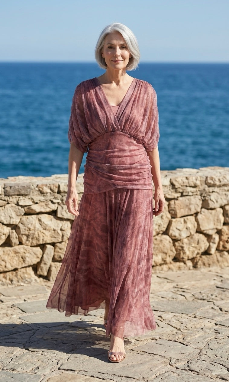 Vestido midi fluido en tonos rosas con efecto degradado, perfecto para invitadas, eventos o cualquier ocasión especial. Su escote pico y cintura fruncida estilizan la figura, mientras que su tejido ligero aporta movimiento y elegancia al caminar. Un vestido favorecedor, cómodo y muy versátil, ideal para mujeres que buscan un look cómodo sin renunciar a la naturalidad.