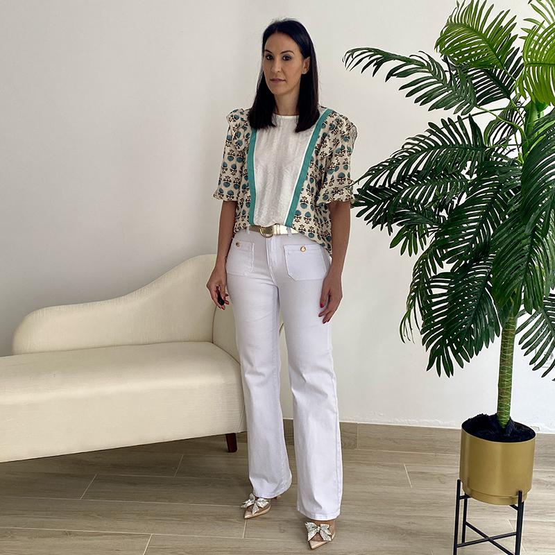 Experimenta la comodidad y el estilo moderno con nuestro pantalón de talle medio alto en tejido vaquero blanco. Ofrece un ajuste perfecto. El cierre de botón y cremallera delantera añade practicidad. Los pequeños bolsillos delanteros con botón perlas y trebillas destacan los detalles. Con un corte recto ajustado y abertura en la parte inferior, este pantalón no solo es fenomenal, sino también una elección ideal para un look elegante y contemporáneo.