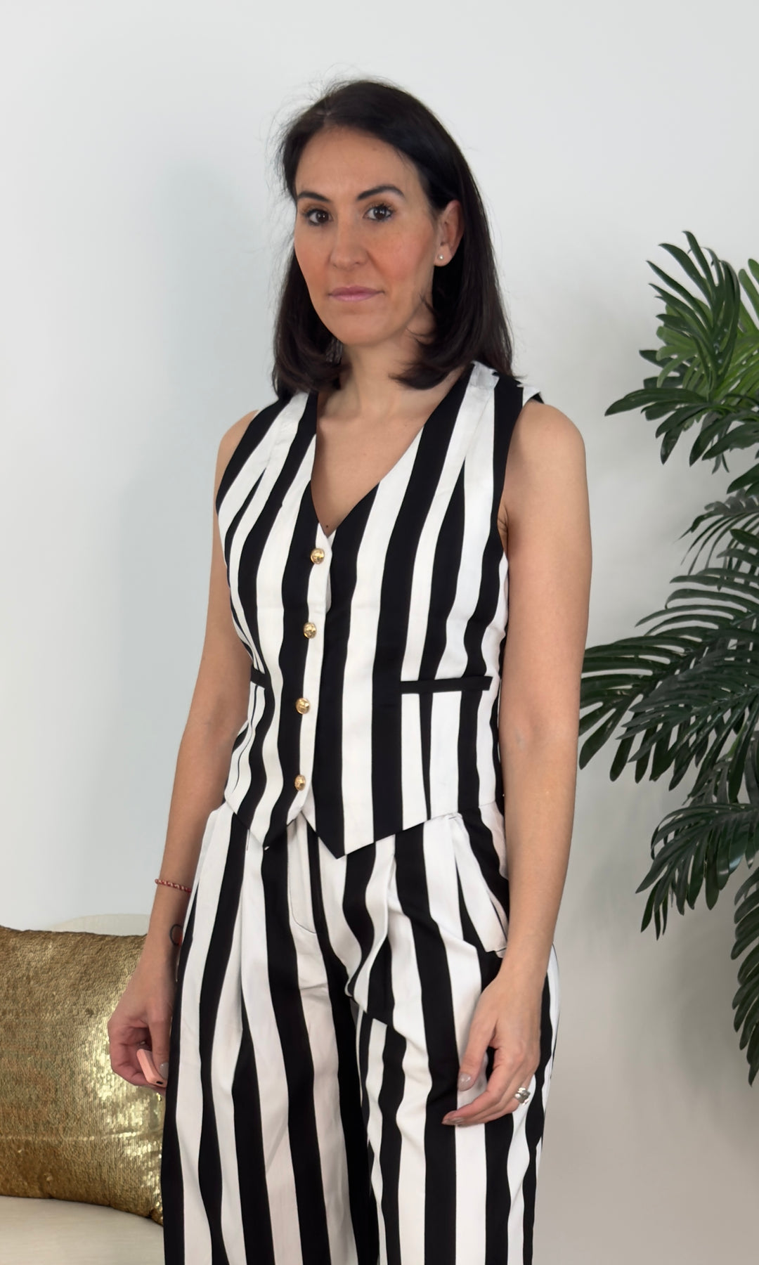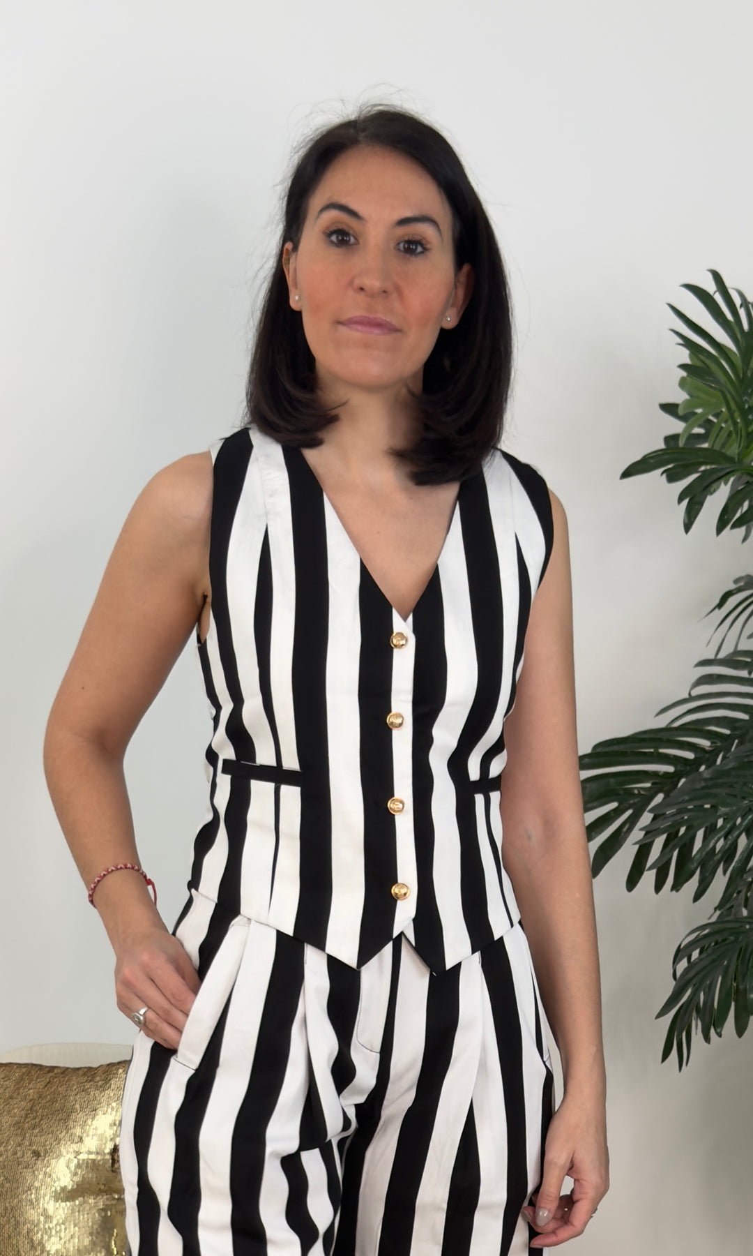 - Chaleco estampado en rayas blanco y negro, estilo esmoquin cierra con botones dorados. Ideal para combinar con pantalón o blazer del mismo tejido. Va forrado.