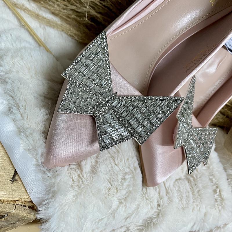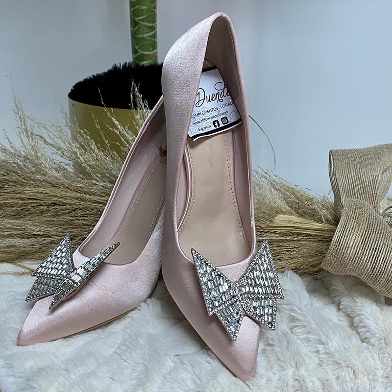 Zapato de Salón de punta fina decorado con un medallón en forma de mariposa en tonos platas, el tacón mide 9cm es fino y no tiene plataforma delantera. Un zapato muy elegante y podrás combinar con vestidos para cualquier evento o con unos jeans.