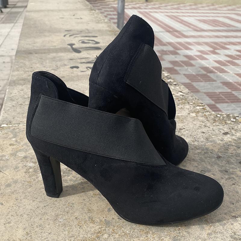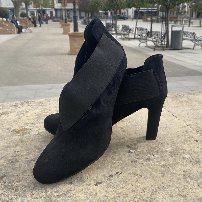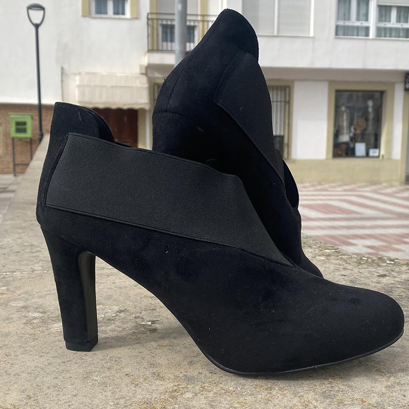 Botin en terciopelo en color negro tiene 7cm de tacon cuadrado es de punta redonda y ajusta el pie con goma elastica. Ideal para combinar con pantalon o vestidos.